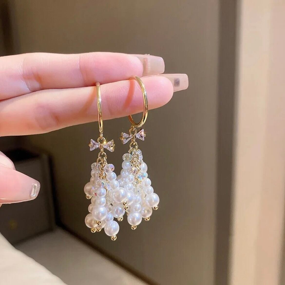 数量限定◆tsubu tsubu pearl ribbon earrins 大ぶり パール ボリューム チェーン イヤリング ロング 可愛い リボン ピアスに見える 痛くない 金属アレルギー 真珠