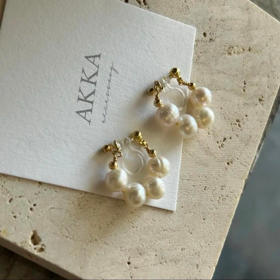程よく輝くパールが上品で、華やかに耳元を飾ります。パールの形がそれぞれ異なり、ご自分だけの一点をお楽しみいただけます。