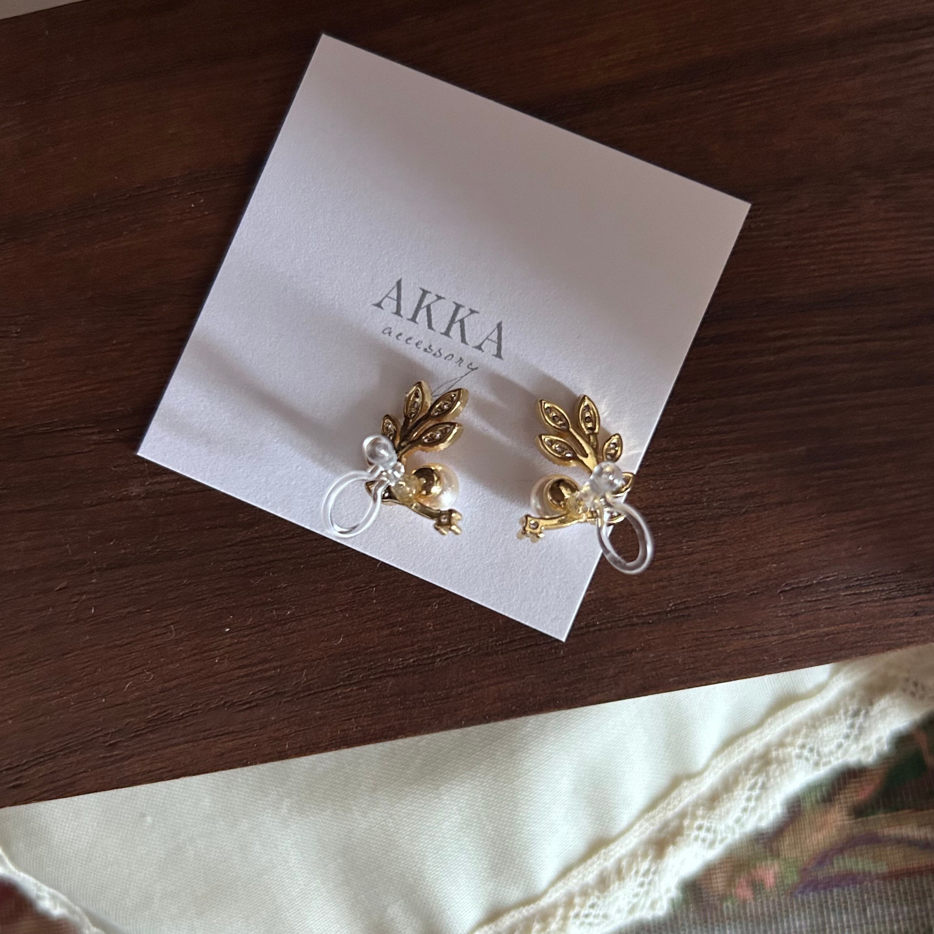 Pearl leaf earring パール&リーフの大人樹脂イヤリング 樹脂ピアス金属アレルギー対応ノンホールピアス一粒韓国ビジュー痛くない