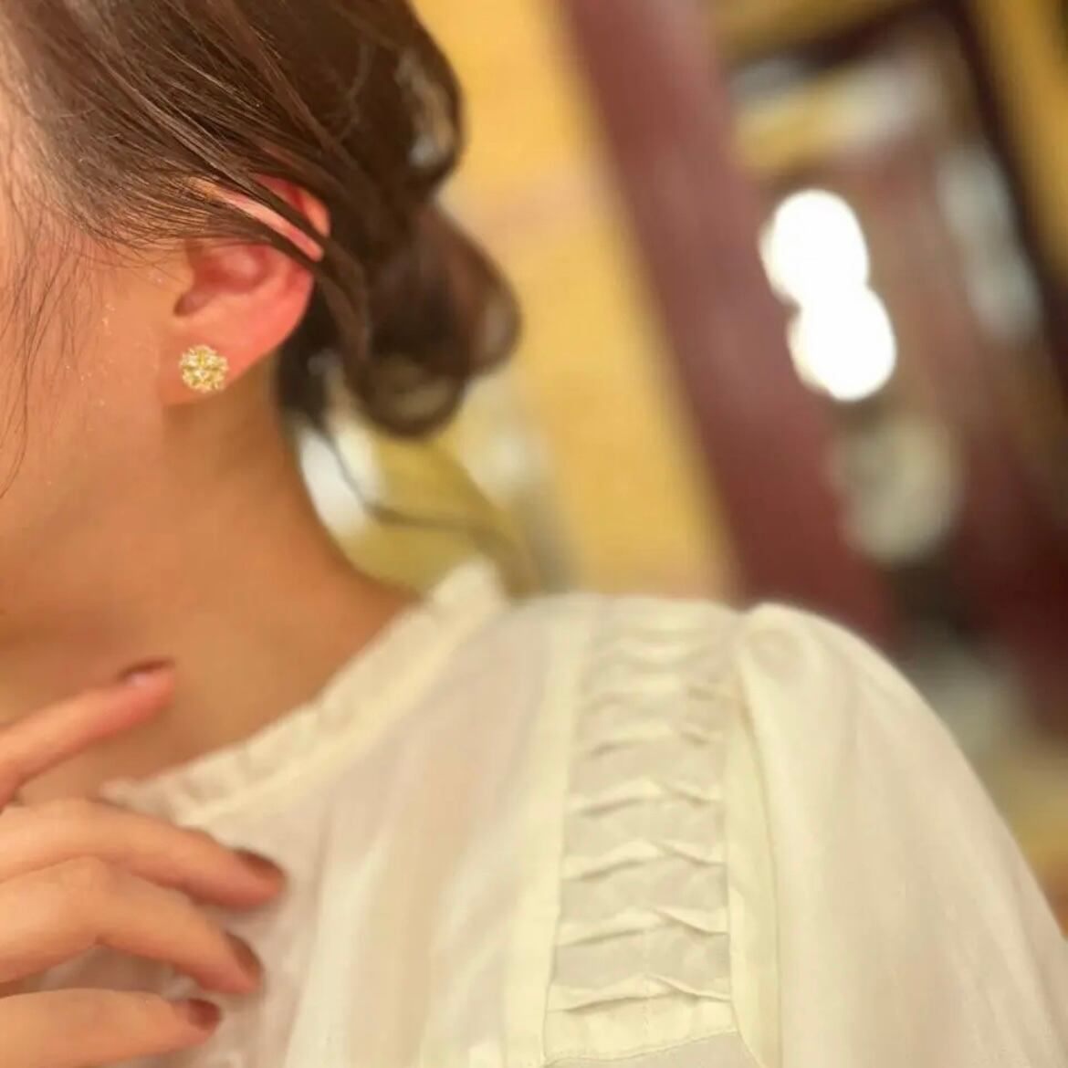 よく見る平面は半円のモチーフと違い、こちらは珍しい完全な球体モチーフとなっており、前面から見ても横から見ても丸い形をキープした存在感のあるデザインです。華やかながらも目立ちすぎない絶妙なデザインで普段使いからちょっとしたお出かけ、セレモニーにと幅広くお使いいただかます。繊細なデザインをお楽しみくださいませ。
