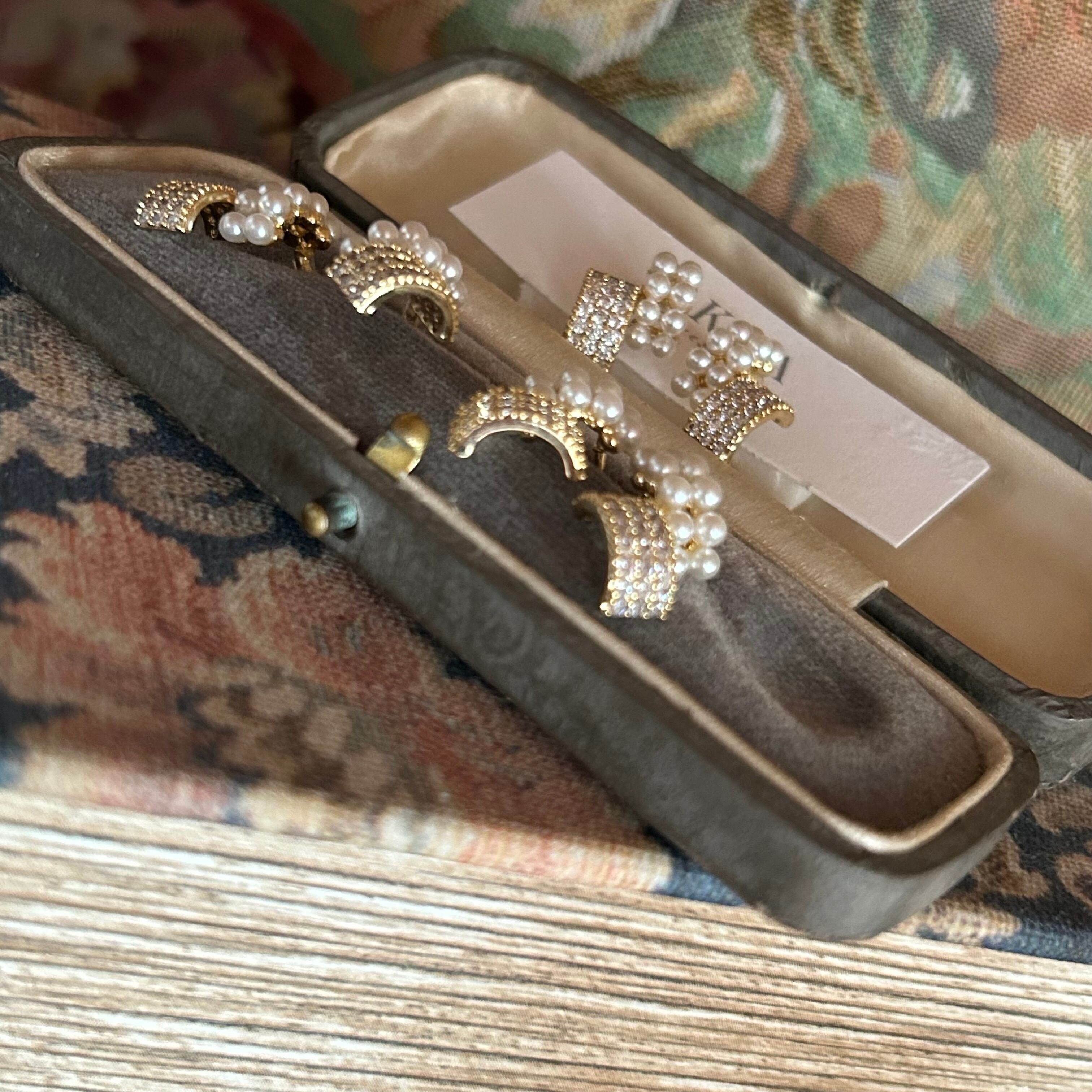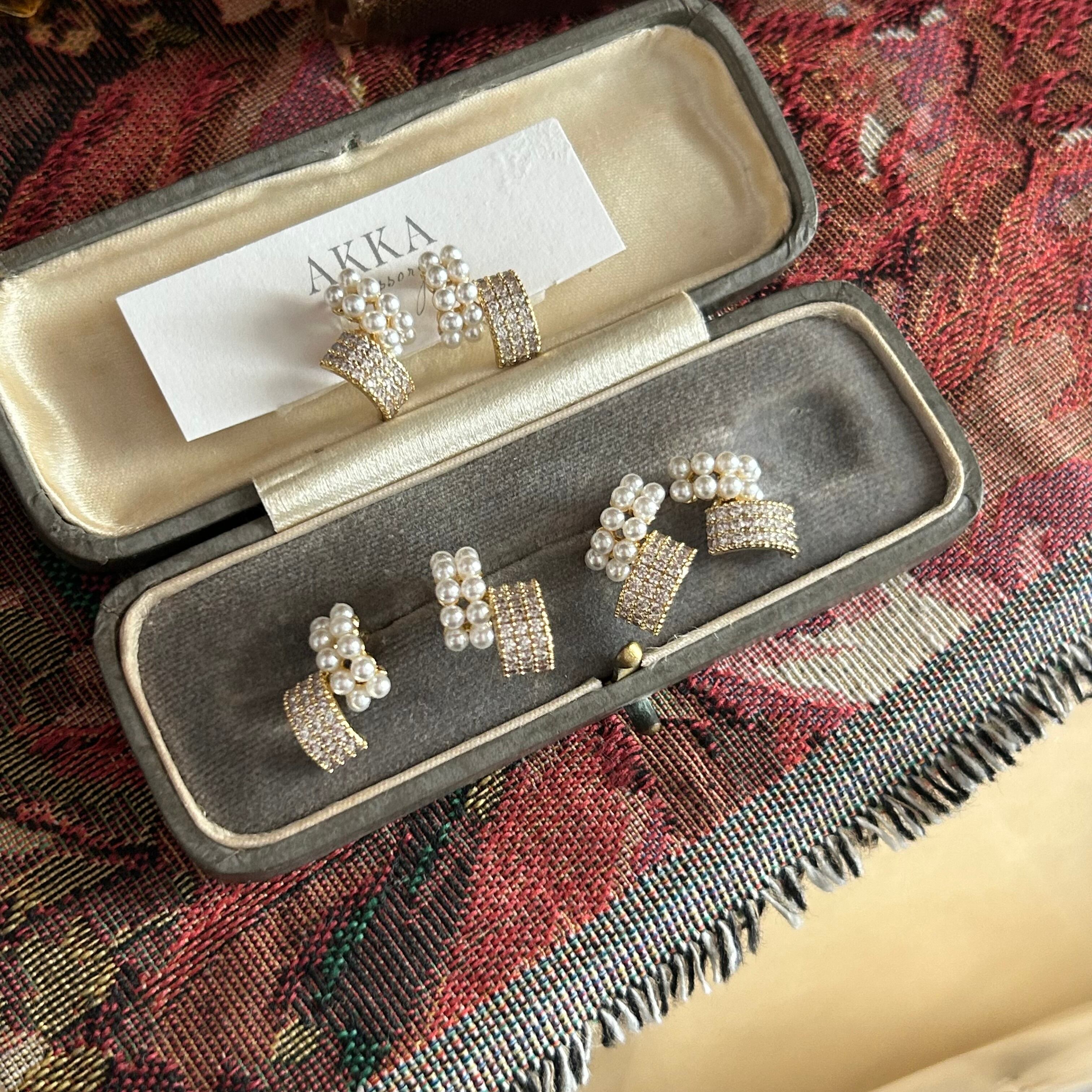 パールとビジューを組み合わせたスクエアモチーフの樹脂イヤリングです。クラシカルな雰囲気のある上品な1アイテムです。