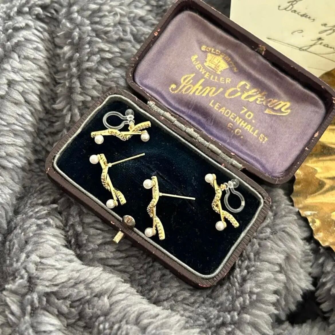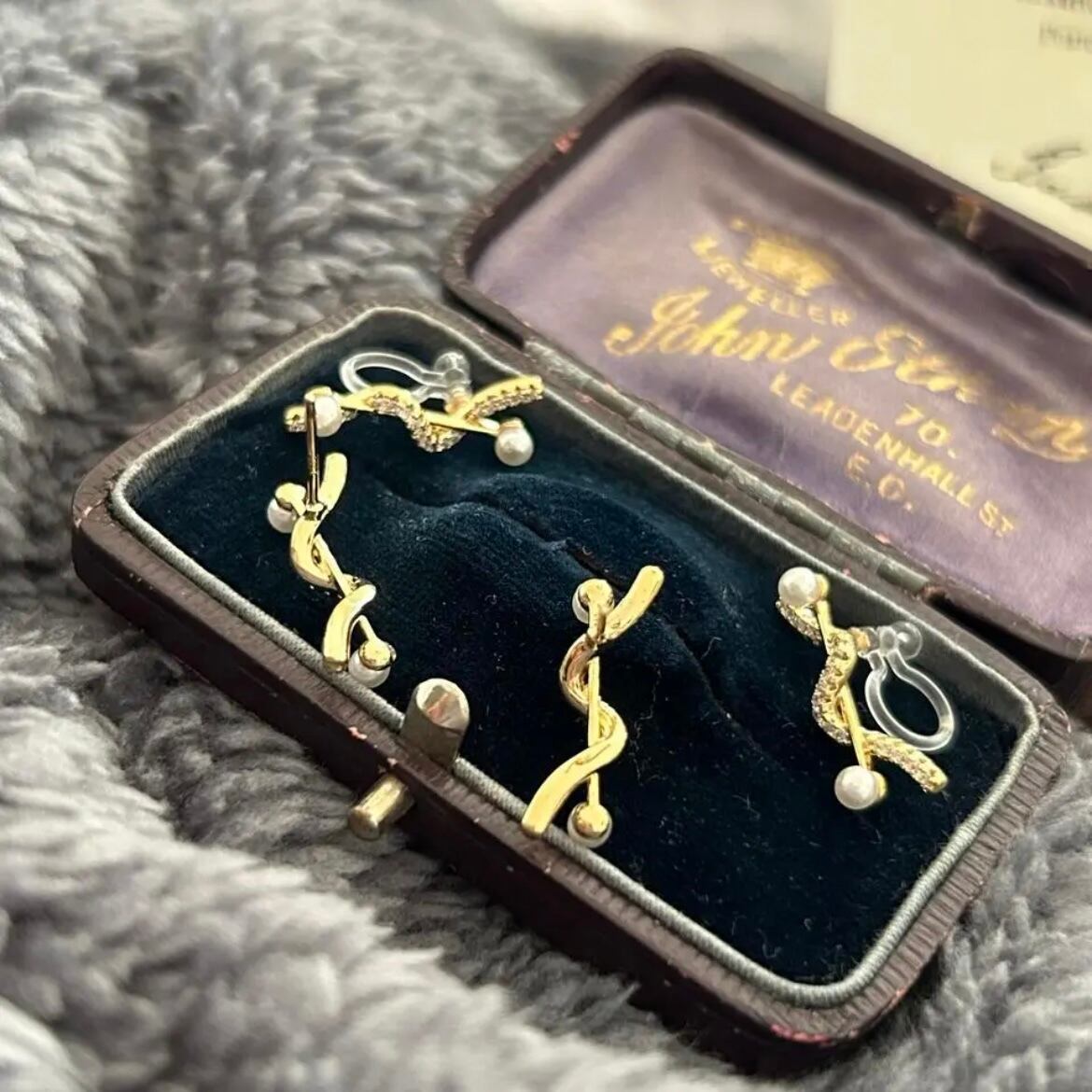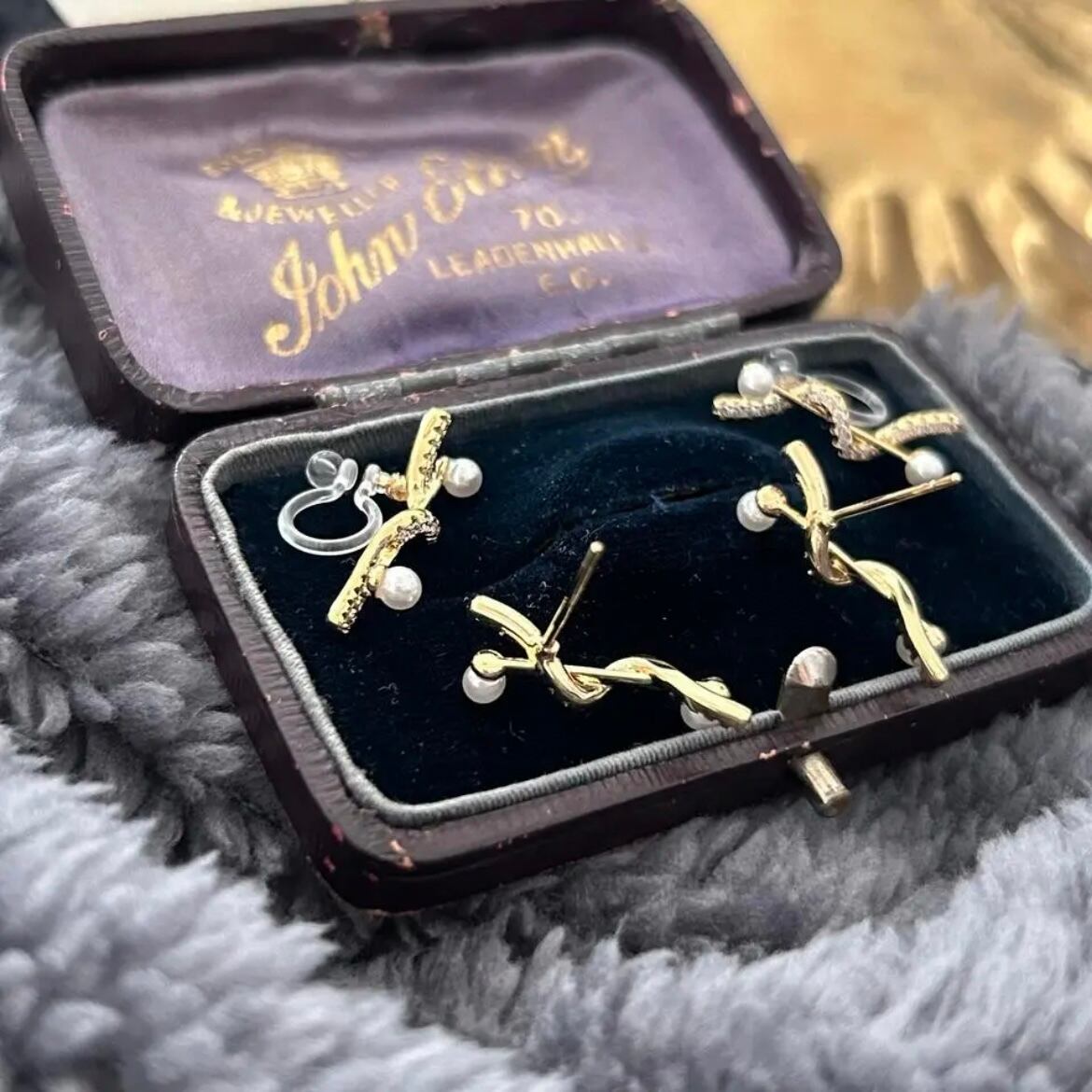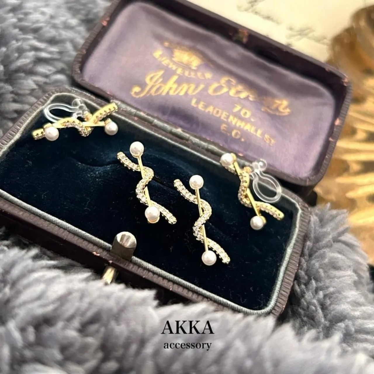 ツイスト型モチーフにダブルパールとビジューが付いた遊び心のある樹脂イヤリングです。小さめで使いやすくオススメです。他各種金具対応可能。上品でクラシカルな雰囲気のあるアイテムです。