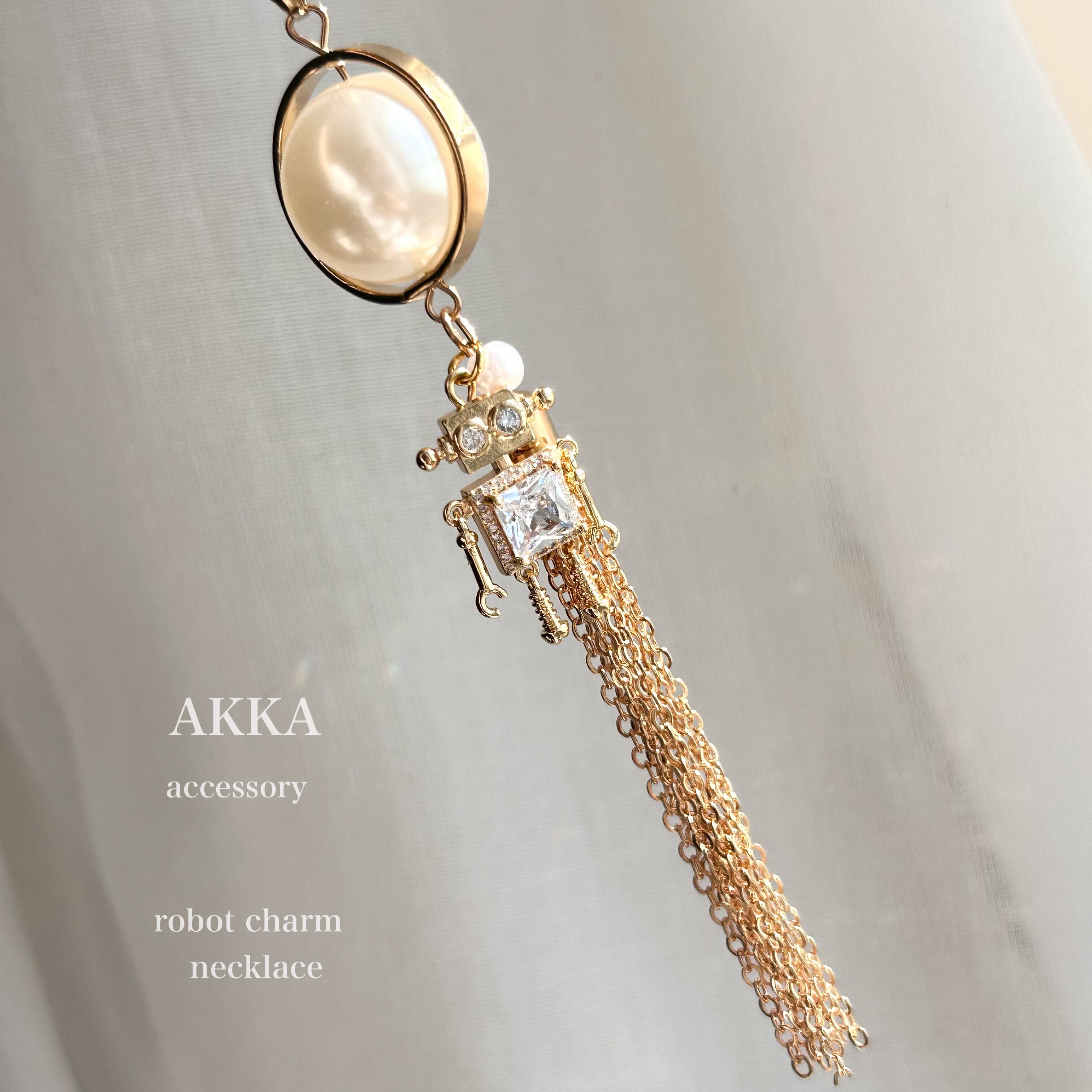 long chain Robot charm necklace ロング チェーン ロボット ネックレス AKKA 可愛い ヴィンテージ風 シンプル デイリー 普段使い 個性的 お洒落 ジルコニア