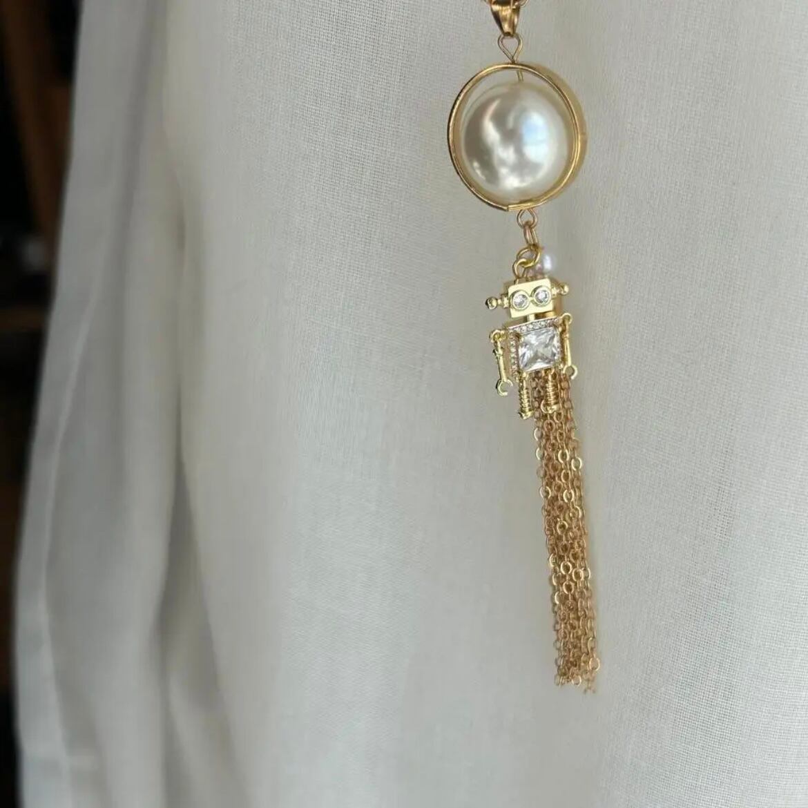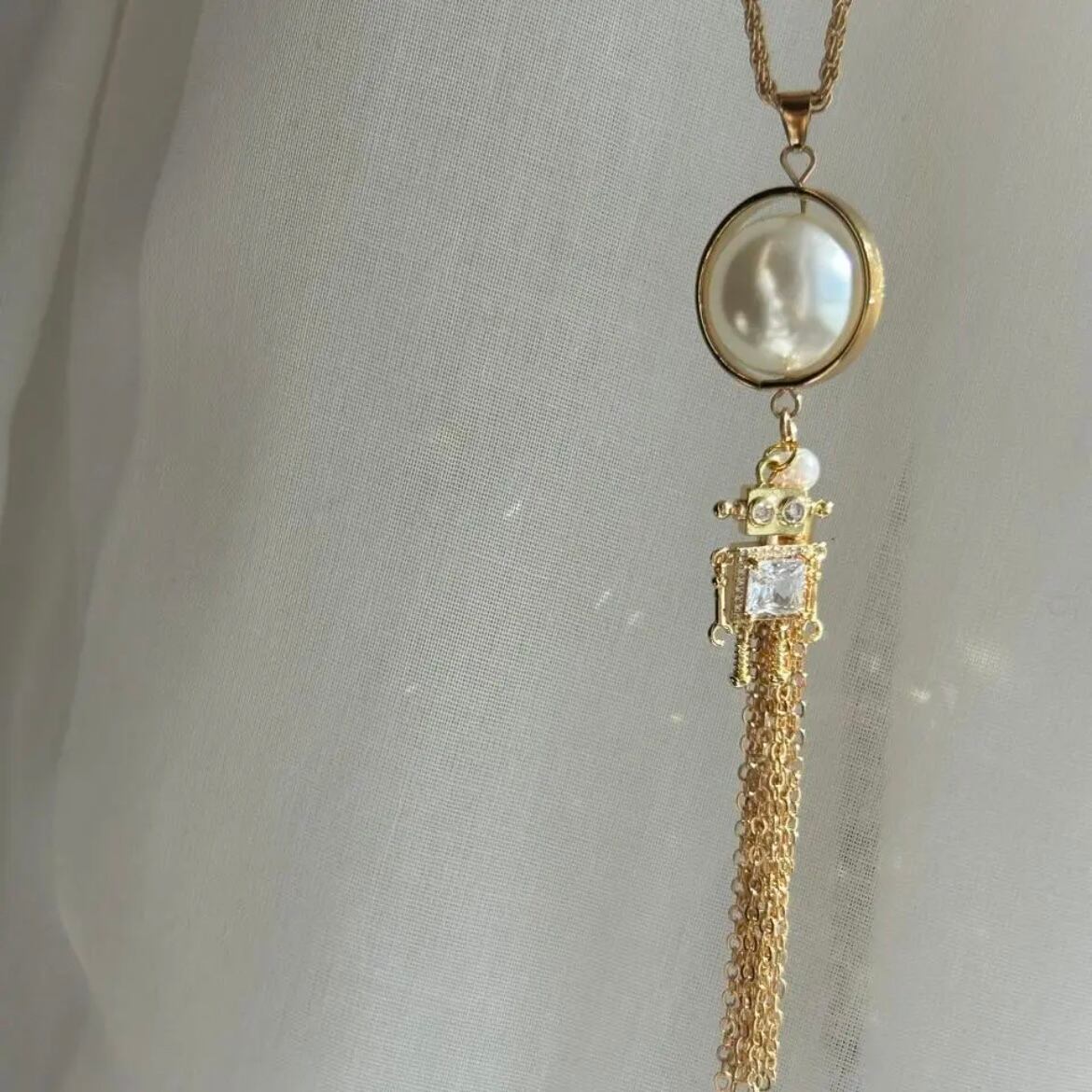 繊細なロボットチャームが美しいロングネックレスです。イヤリング・ピアスも出品しています。
