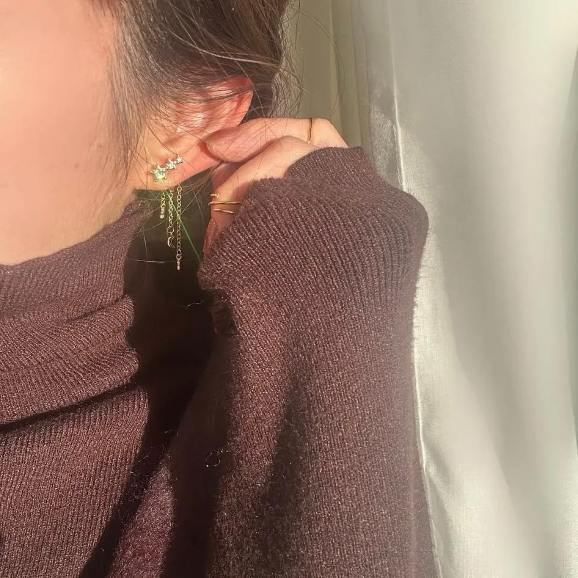 大小の連なるスターが可愛い樹脂イヤリングです。こちらは耳の後ろからチェーンが垂れ下がるデザインで、まるでピアスをしているかのような見た目となっております。