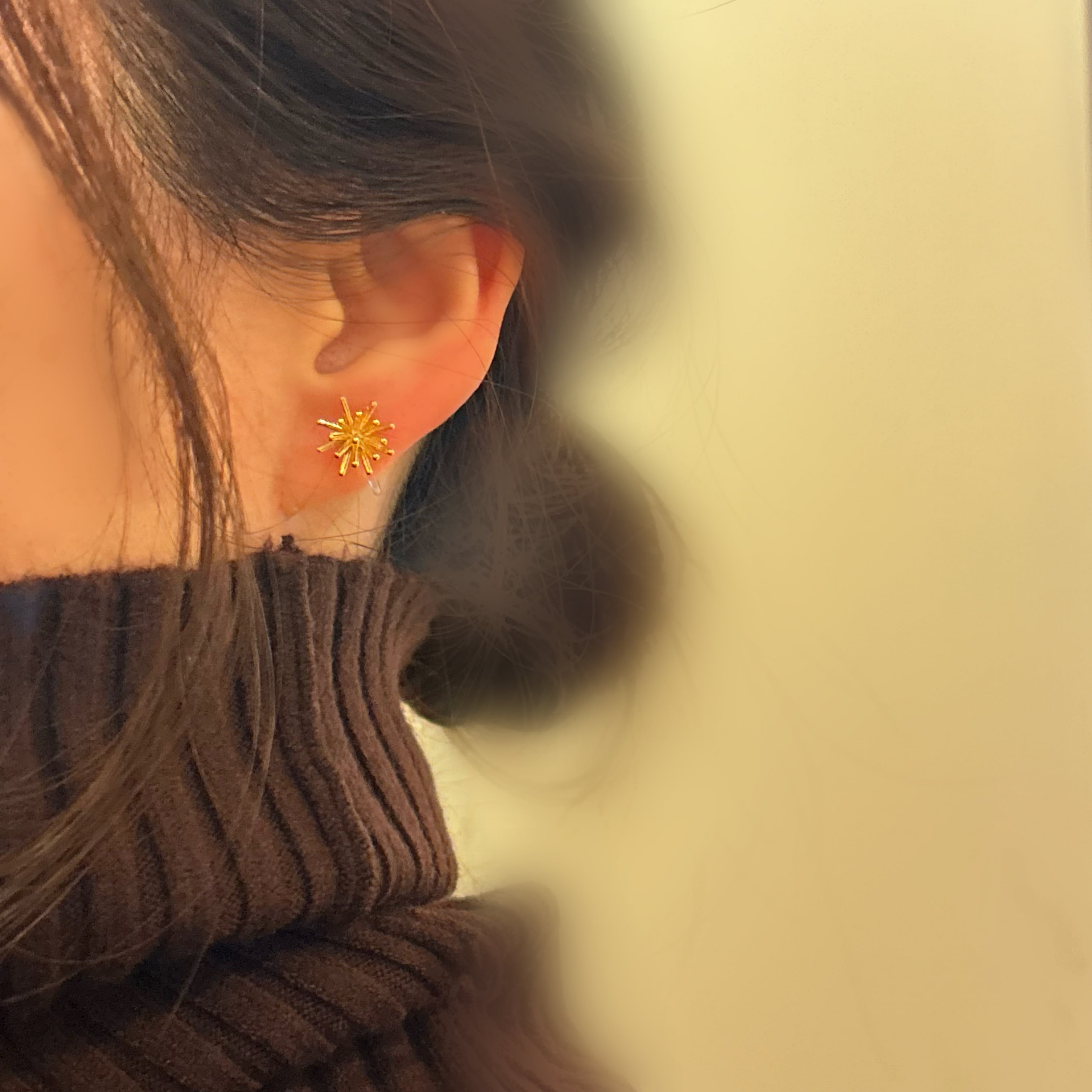 立体感のあるニードルが可愛らしいスターモチーフのミニイヤリングです。18kゴールドコーティングで艶やかな質感が美しいです。ニードル一本一本が煌めき、ミニサイズながらも存在感があります。あまり見かけない遊び心のあるデザインが、周りと差を付けるポイントです。普段使いにもお出かけにもおすすめの万能アイテムです。
