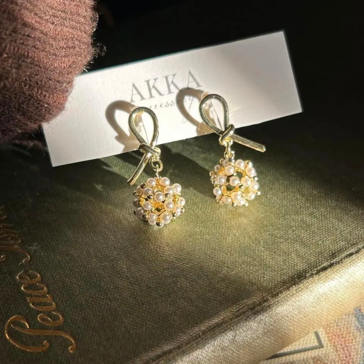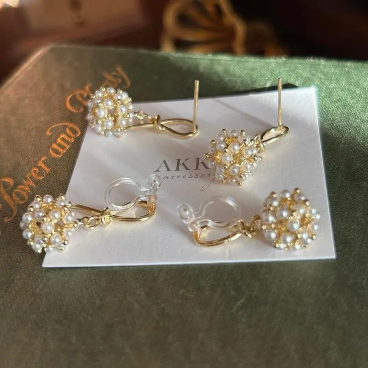 結び目モチーフがポイントの、粒々パールボールのイヤリングです。パールボールは、よく見るとパールとパールの間にとても小さなゴールドの粒が散りばめられており、繊細な作りとなっております。