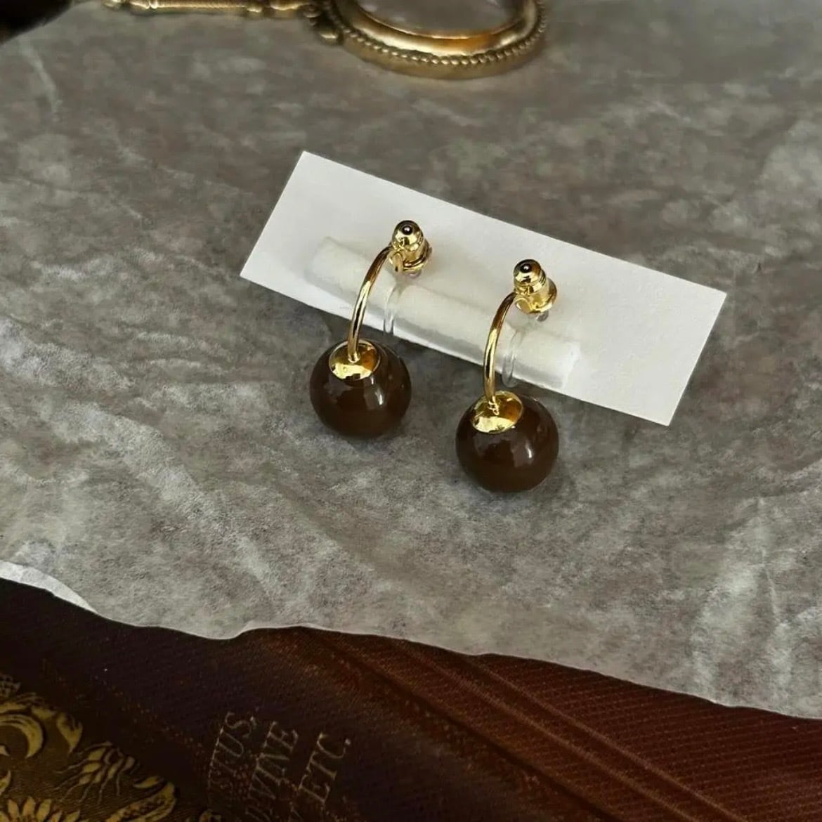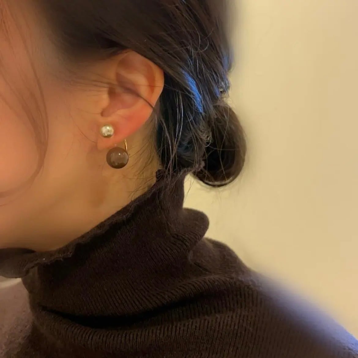 ブラウンカラーボールとシャンパンゴールドパールのイヤリングです。