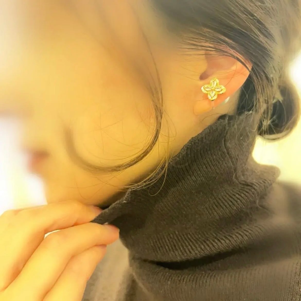 ストーンが埋め込まれている部分の土台裏側には、小さな穴が空いておりますが、そうすることで裏側からビジューに光が入り、キラキラと輝き度が上がります。また、穴があることで軽量化されており見た目以上に軽く、長時間使用でも軽やかな着け心地です。