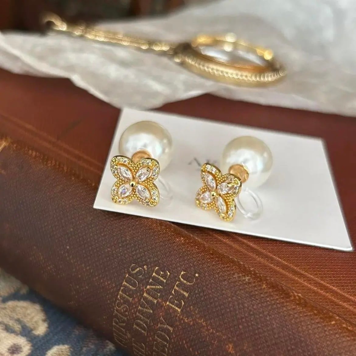 フラワーを前にしても、パールを前にしても使いやすいデイリー使いにぴったりなオススメアイテムです。ピアスの場合はバックパールを付けずに、普通のフラワーピアスとしてもお使いいただけるよう、通常のキャッチもお付けさせていただきます。