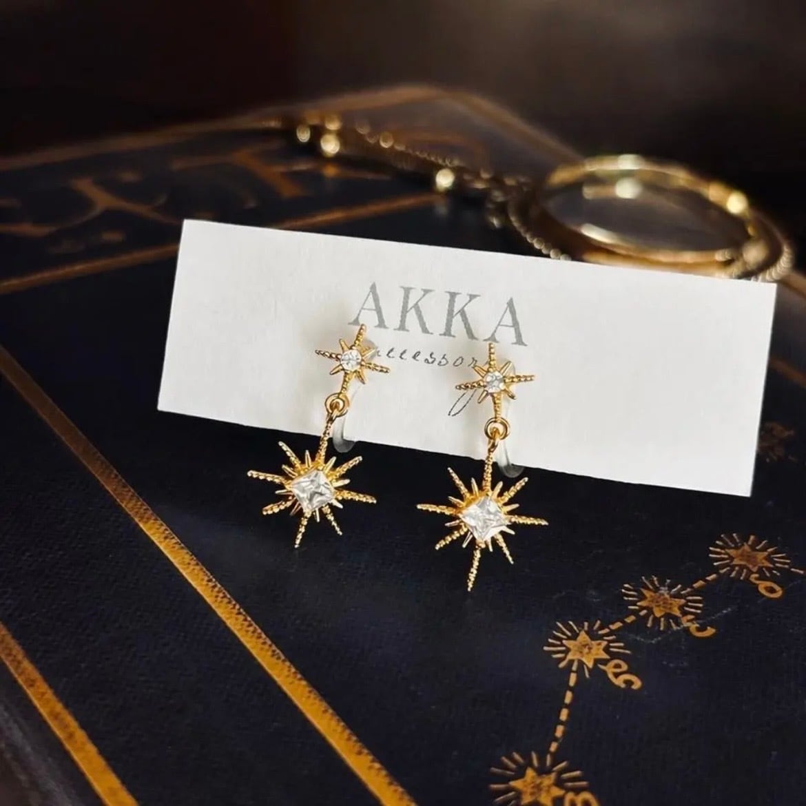 gold:double star burst design earring ニッケルフリー silver925 スター 樹脂イヤリング ピアスに見える ピアス風 痛くない アレルギー AKKA 金アレ ピアス 小さめ ミニ