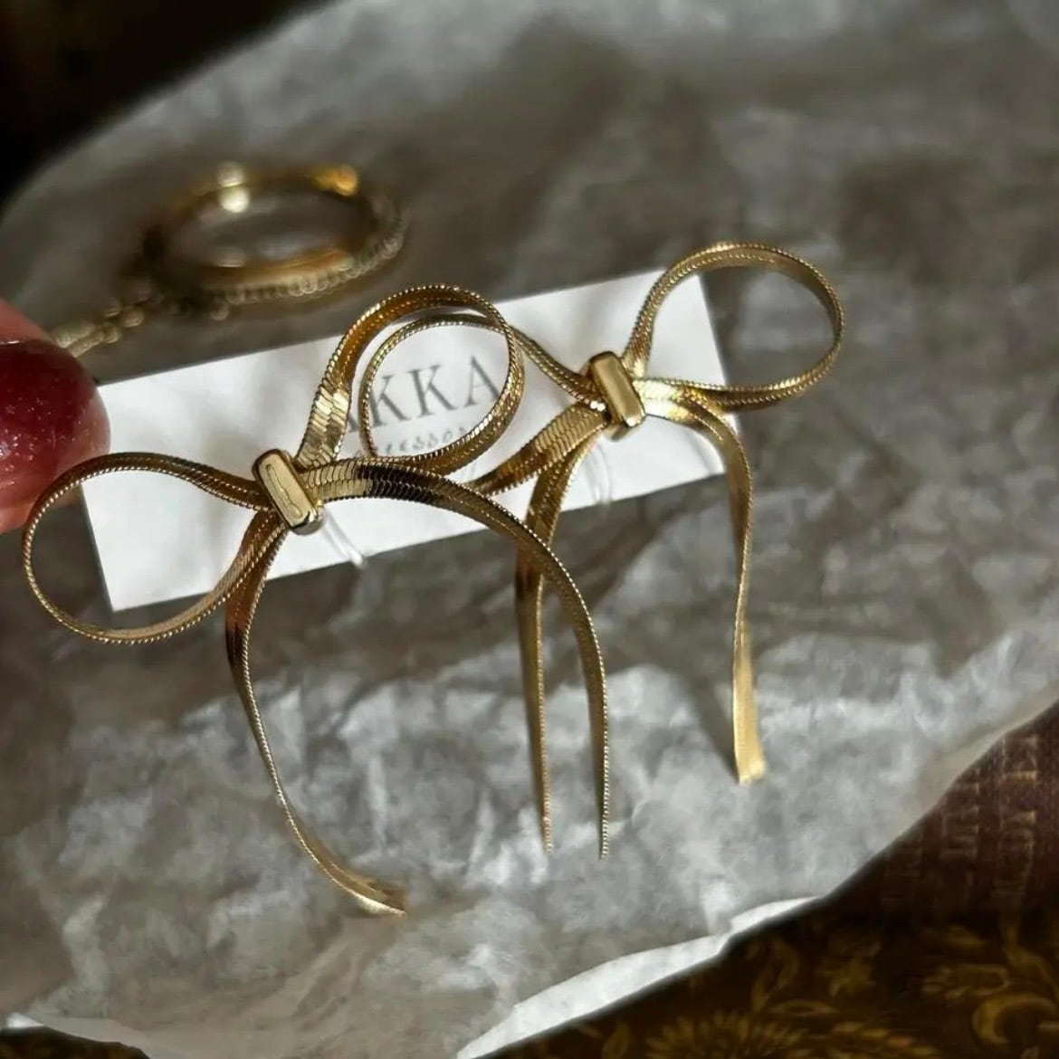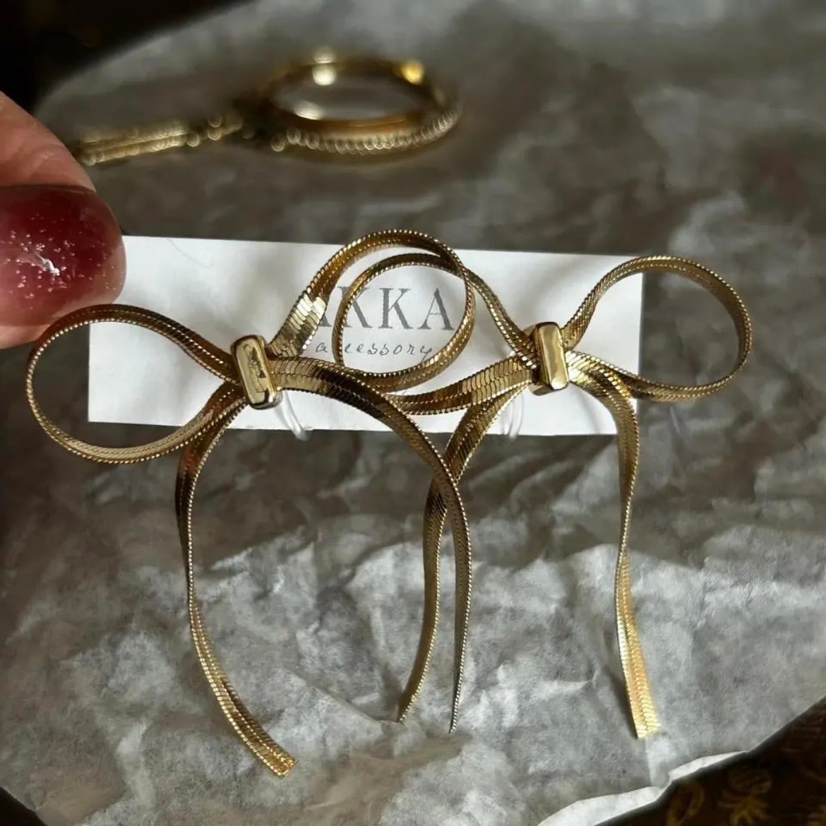 こちらは幅3ミリの太めスネークチェーンを使用することにより、緩いシルエットとしなやかさな動きが出て、大人っぽい仕上がりとなっております。リボンでも可愛くなりすぎずに、スーツやジャケットなどかっちりしたものとも相性◎です。抜け感を出す時のポイント使いにもオススメです。
