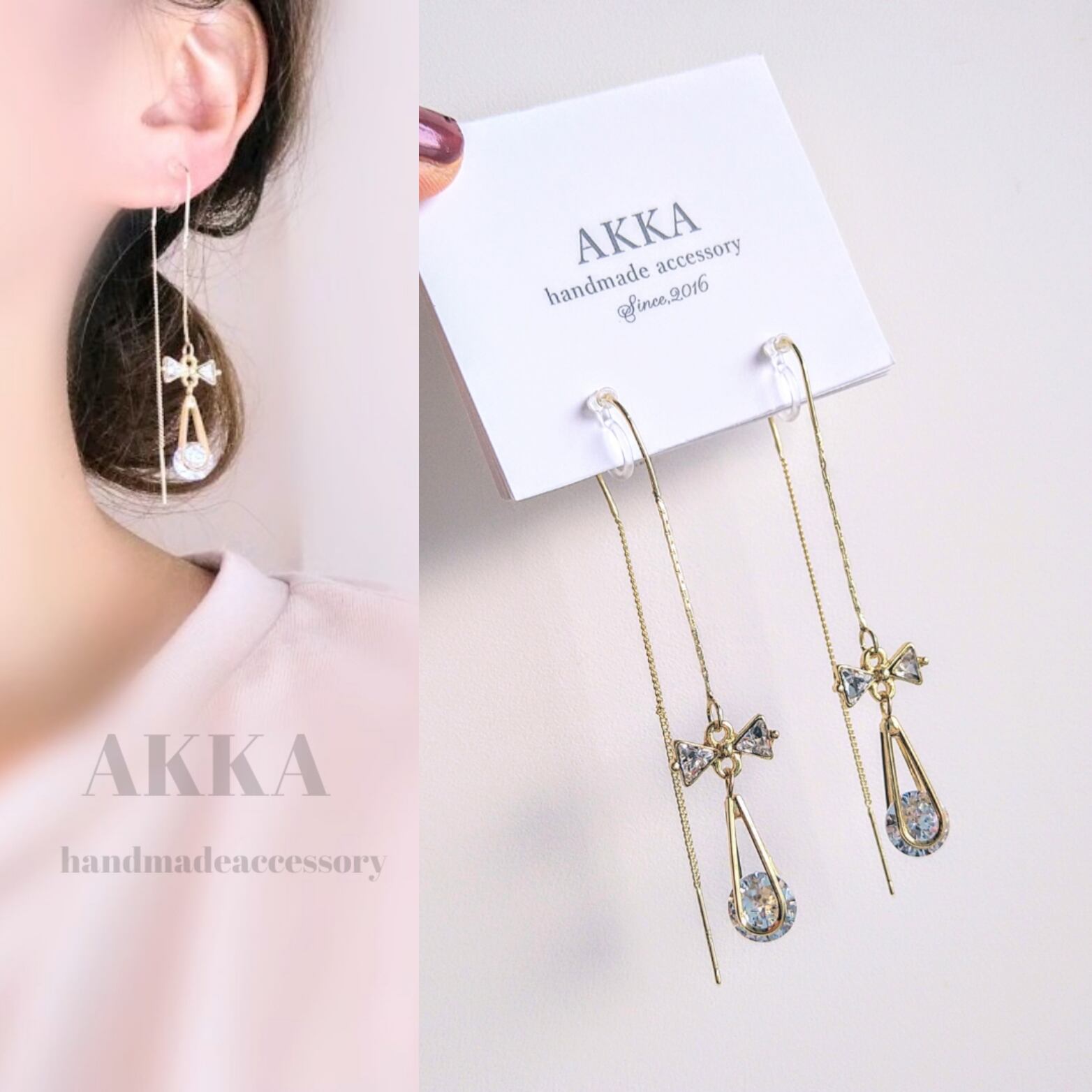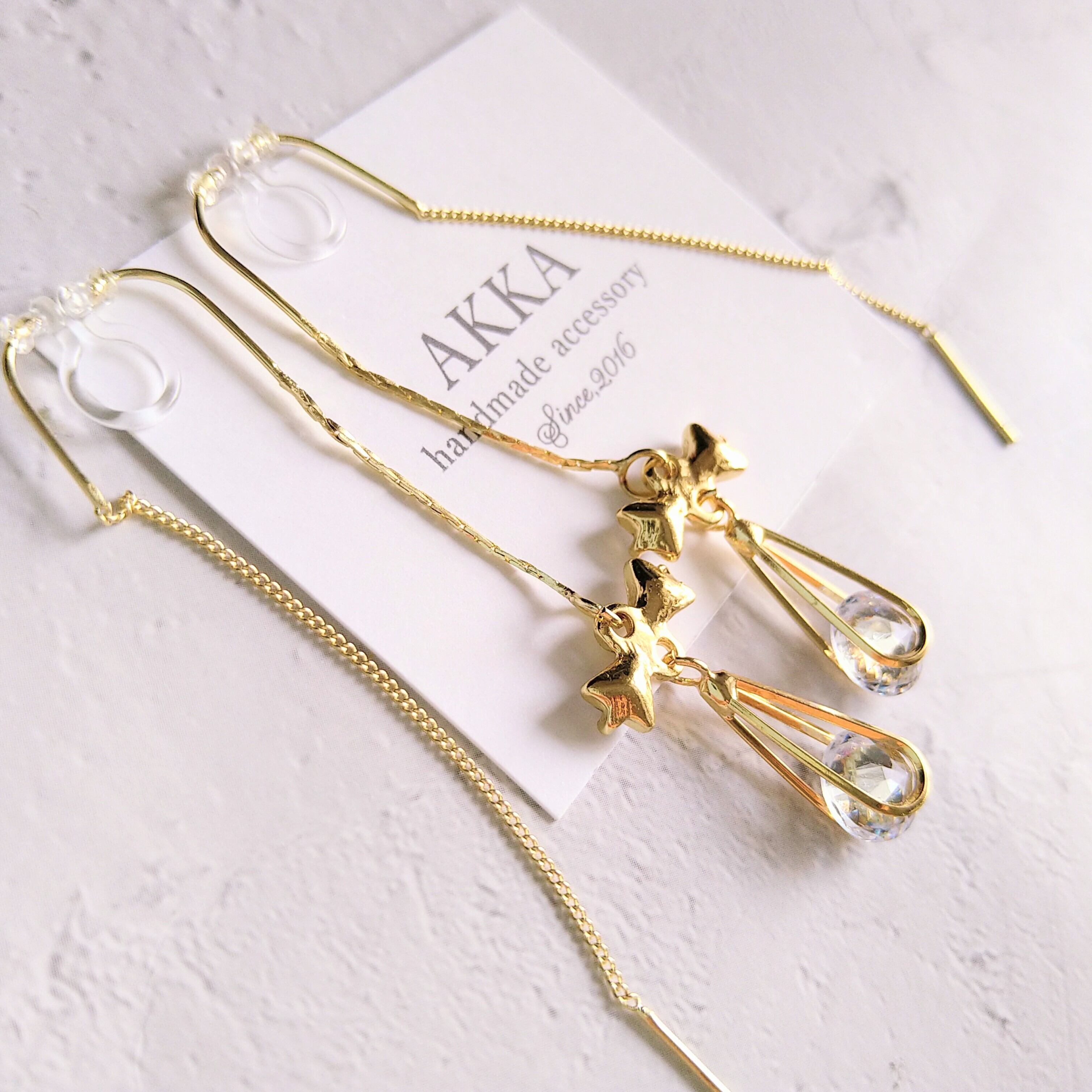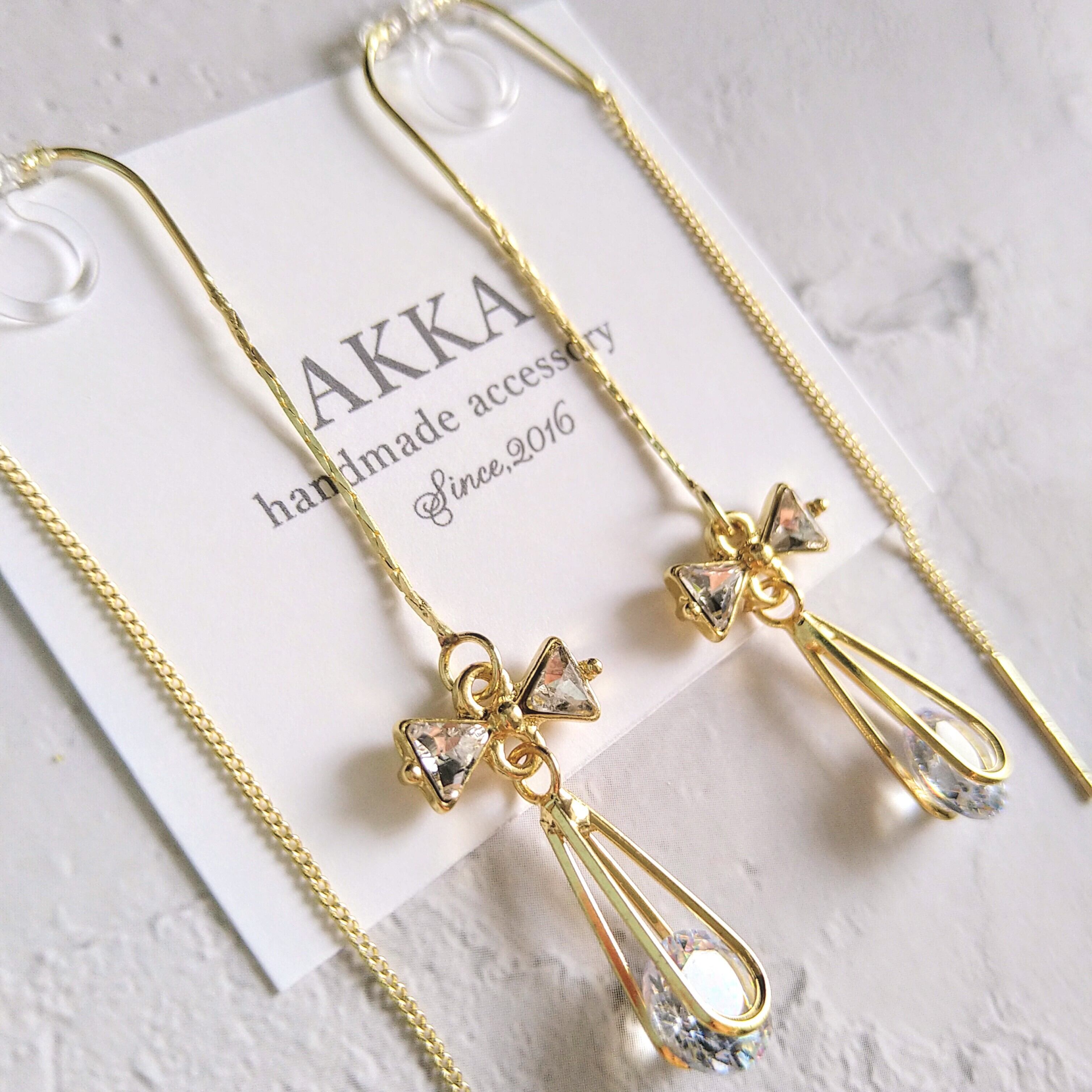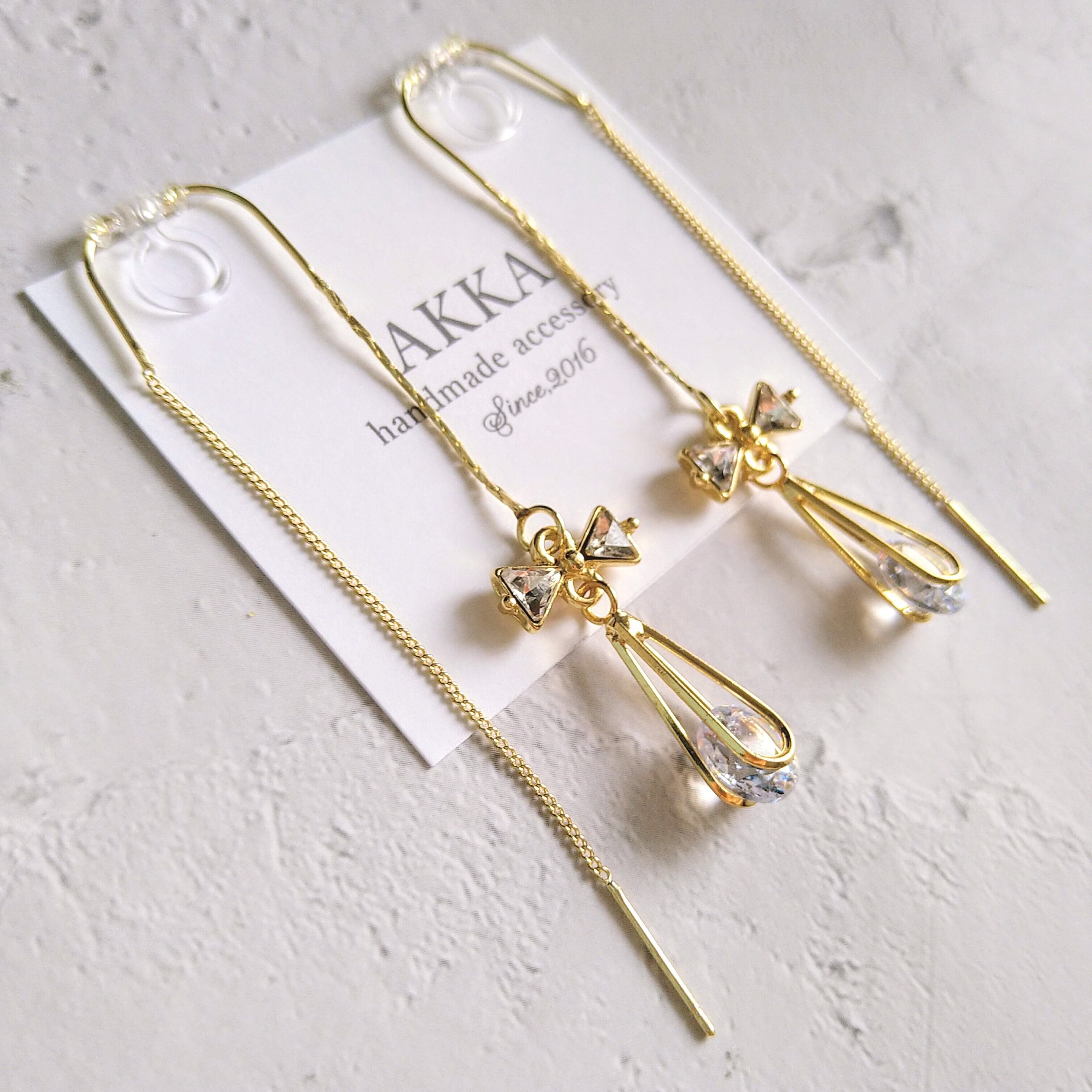 小さなリボンとしずく型ビジューを組み合わせたイヤリングてす。