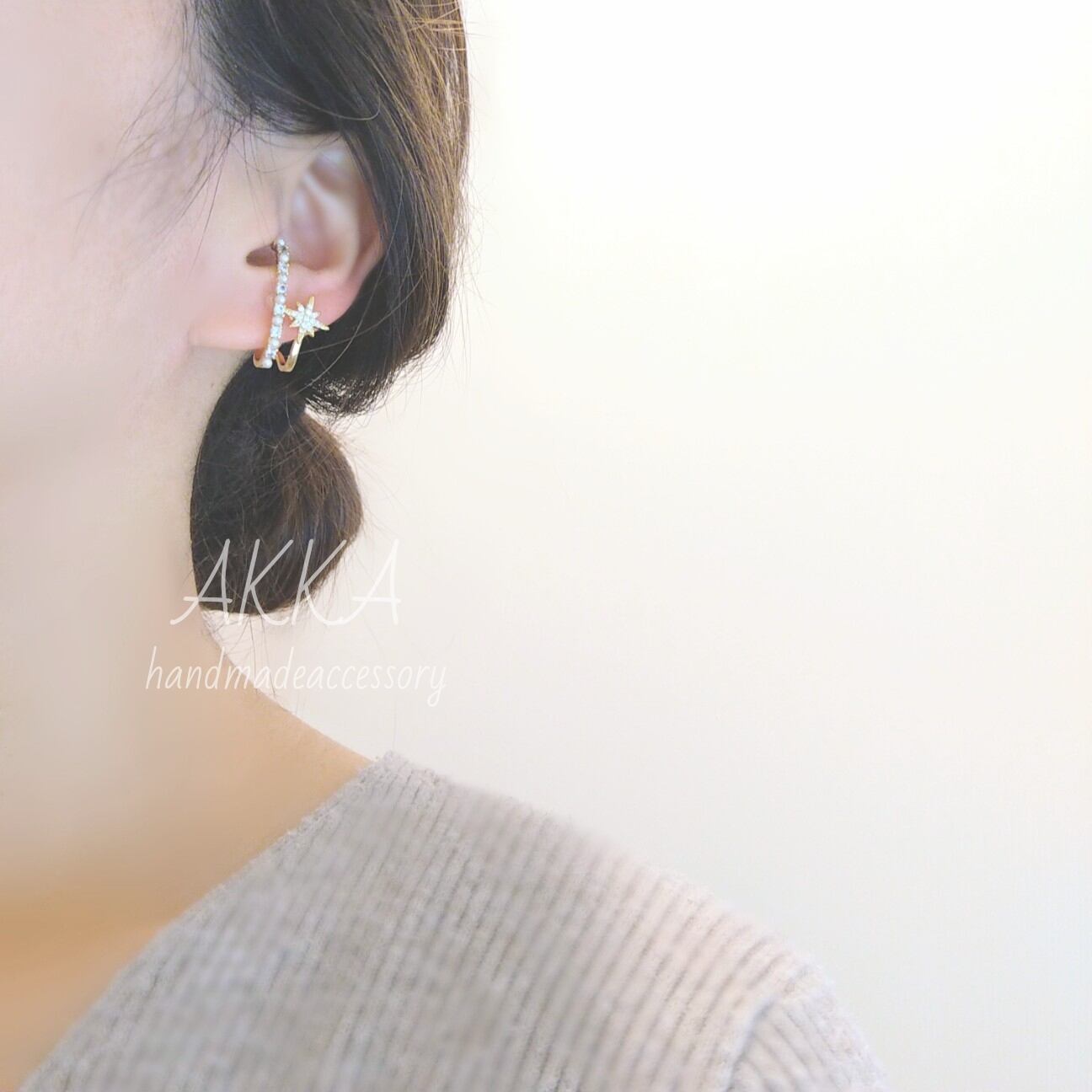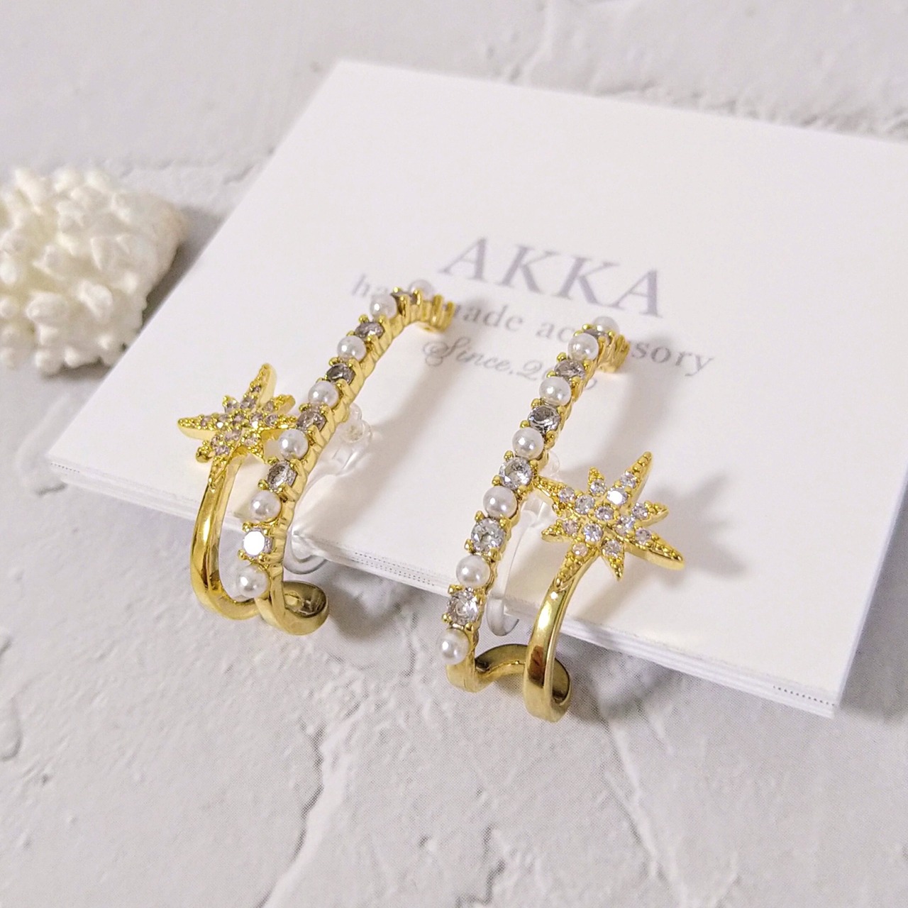 スターとビジュー&パールフープの2連風樹脂イヤリング 樹脂ピアス金属アレルギーノンホールピアス韓国可愛い