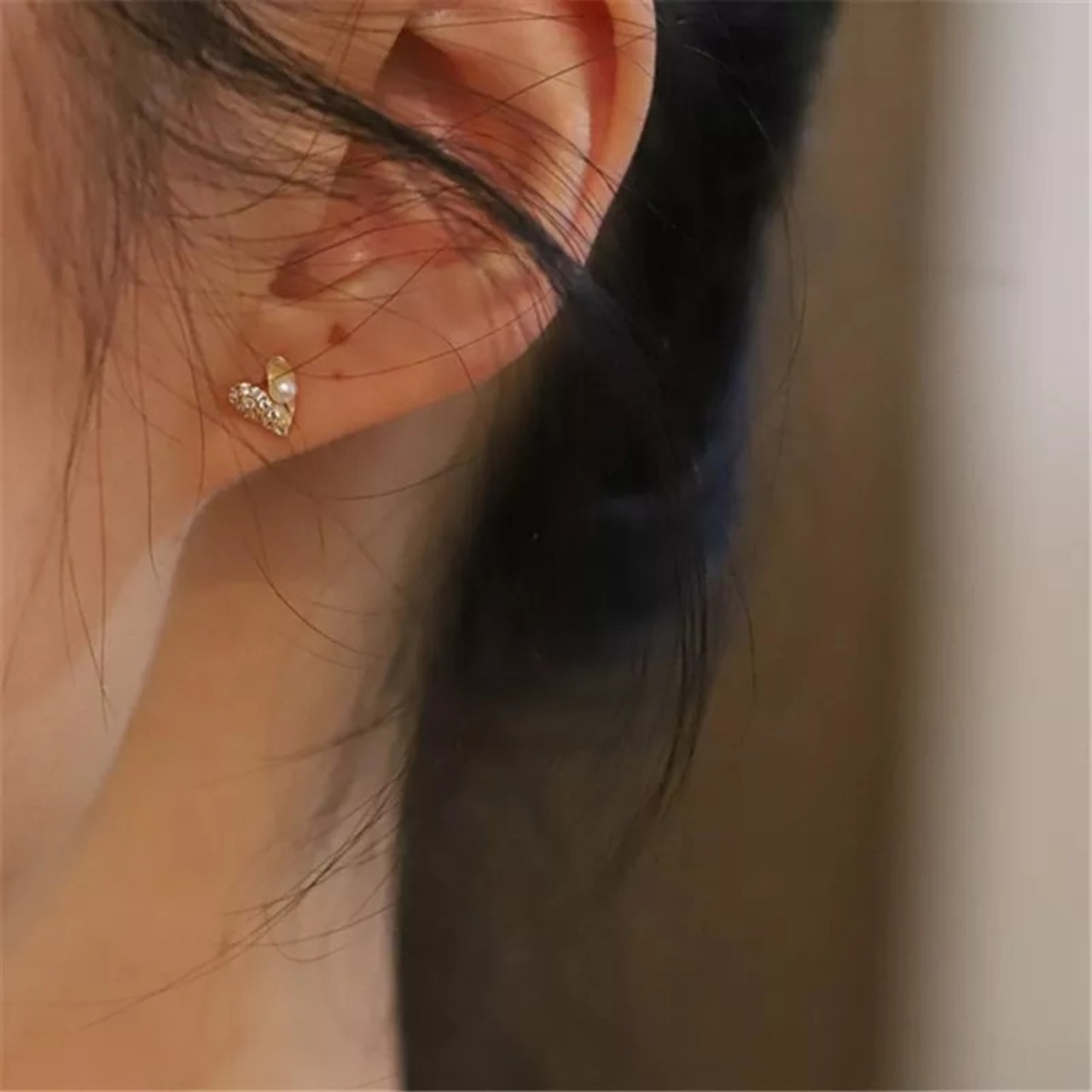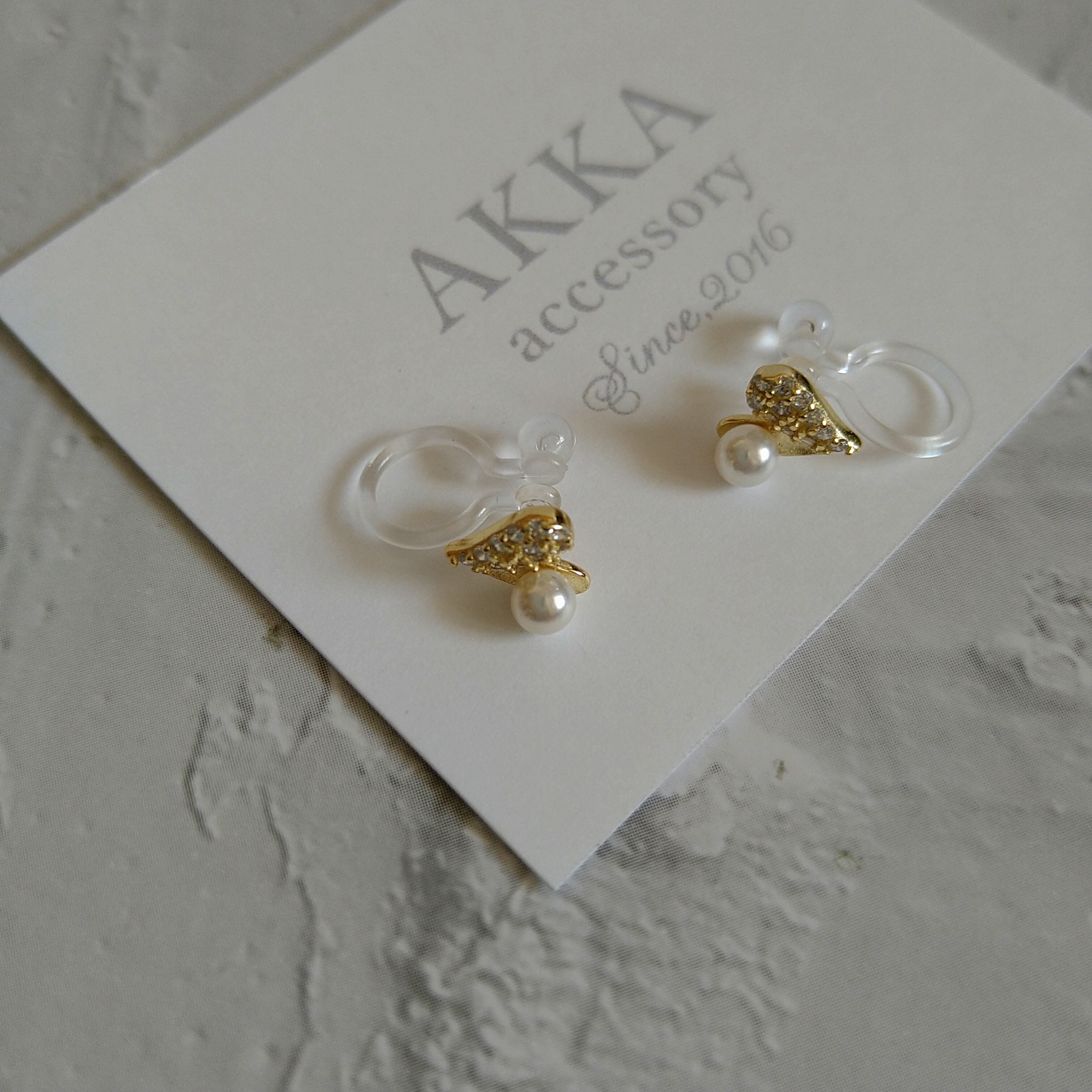 パールとビジューのプチハートイヤリング 樹脂イヤリング樹脂ピアス金属アレルギーノンホールピアス韓国可愛い