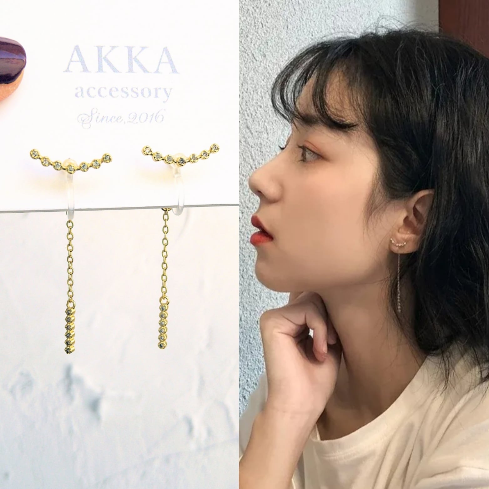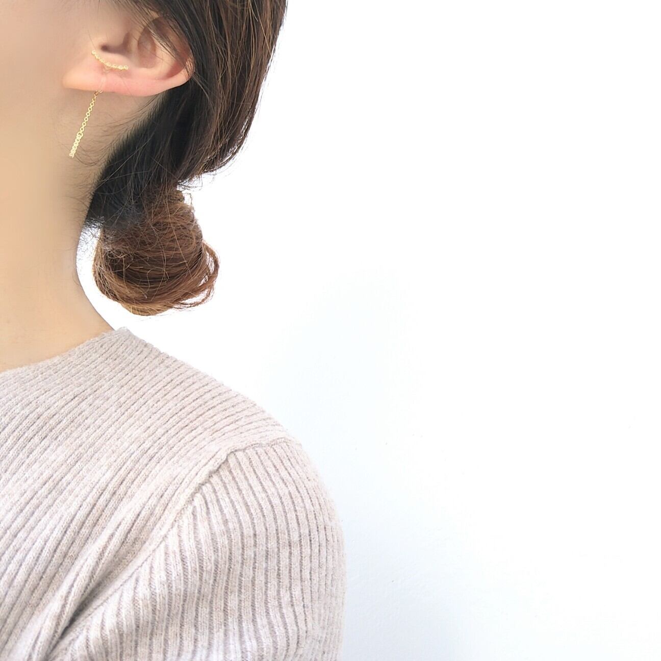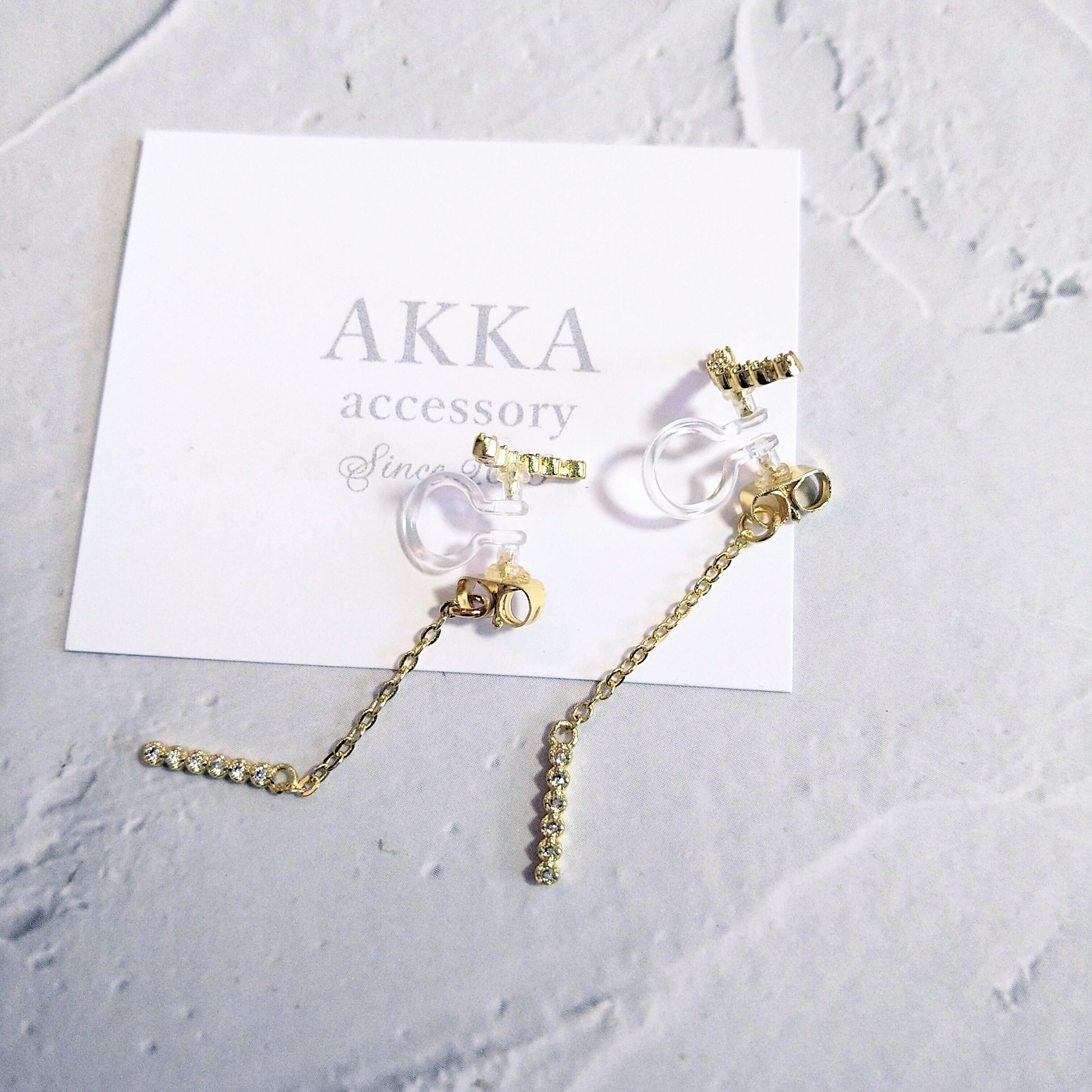ビジューとチェーンのシンプルロング樹脂イヤリング 樹脂ピアス金属アレルギーノンホールピアス韓国ゴールドアクセサリー