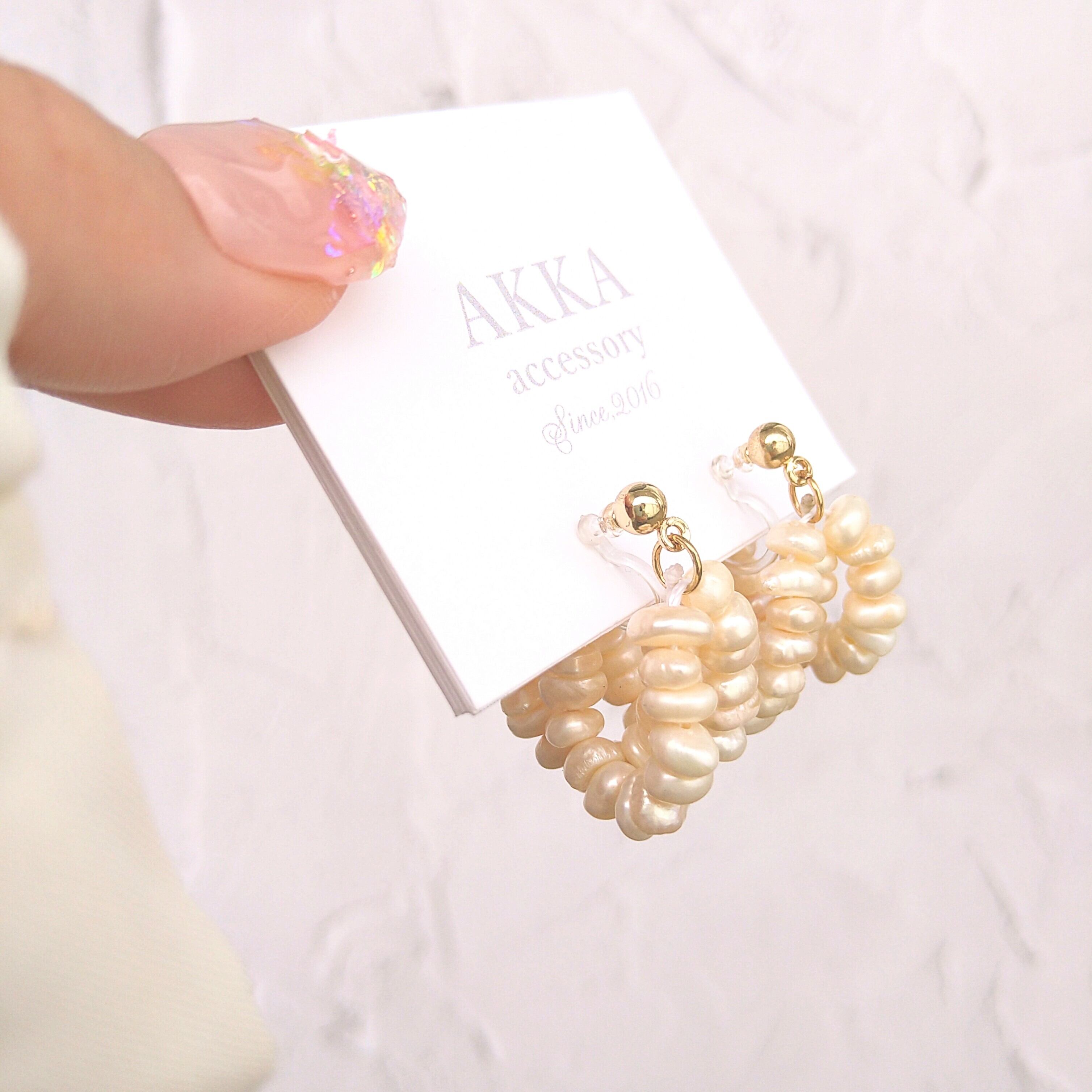 たっぷりパールの樹脂フープイヤリング ヴィンテージ樹脂イヤリングフープピアス樹脂ピアス金属アレルギー真珠淡水パール