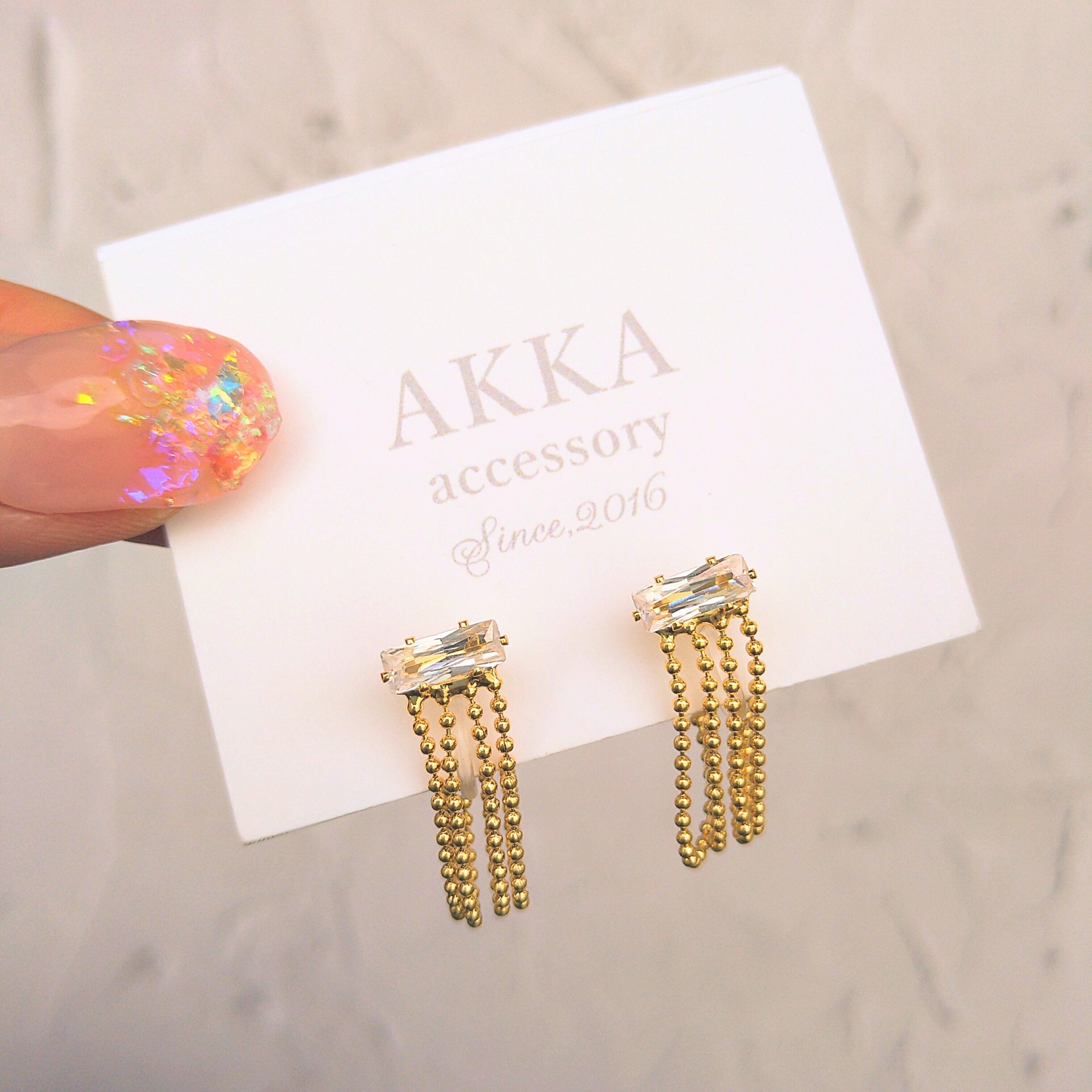 レクタングル型のガラスストーンと4連のボールチェーンが素敵なフープイヤリングです。金属ポストピアスに変更可能です。