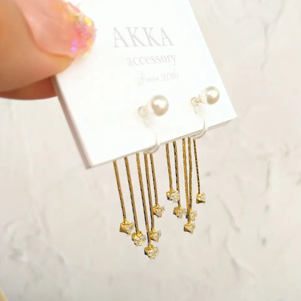 耳の下から5連のジルコニア付きチェーンがのぞくデザインになっており、ピアスのような見た目です。
