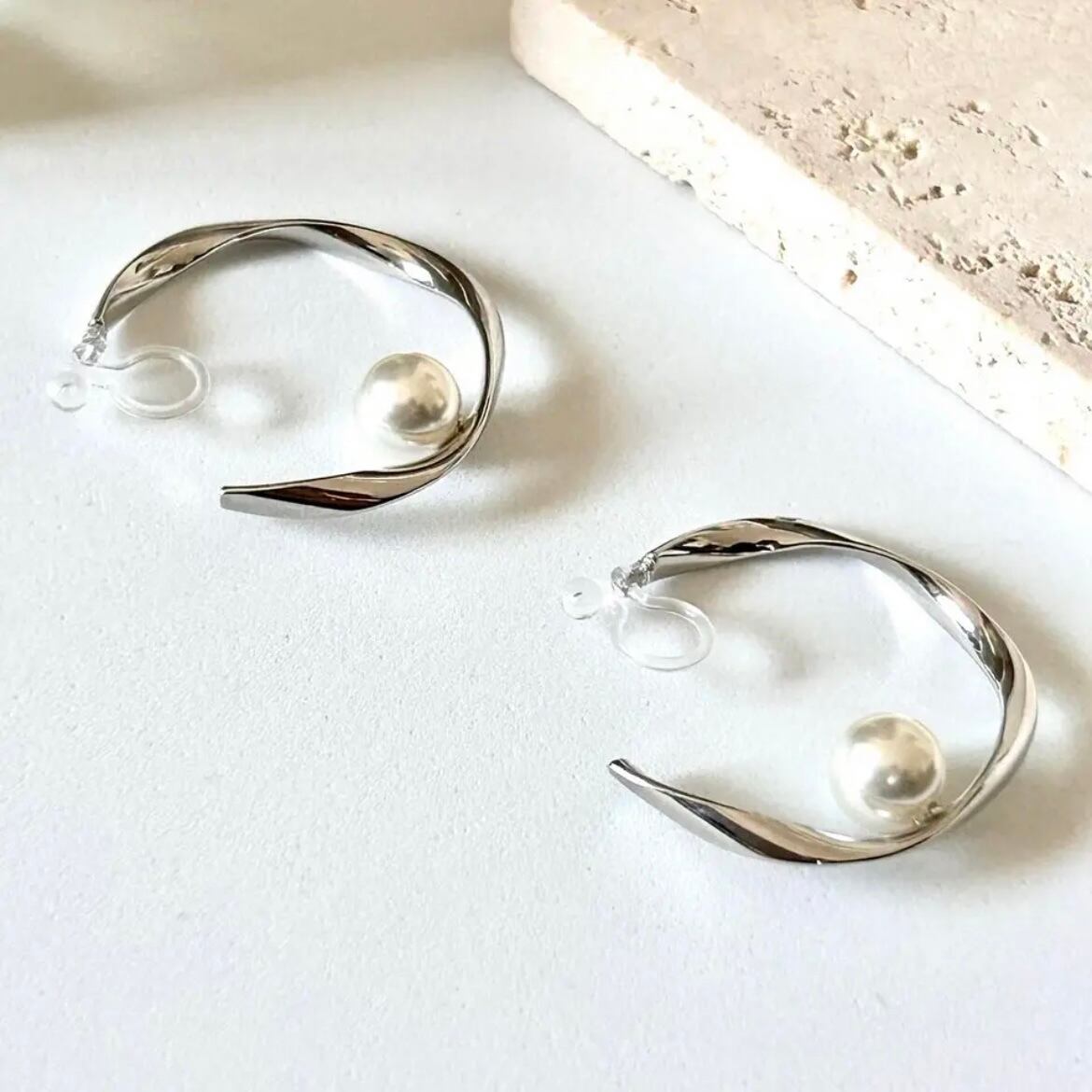 Silver twisthoop&pearl 樹脂イヤリング/樹脂ピアス/金属アレルギー対応/樹脂ノンホール/ノンホールピアスフープイヤリングフープピアス痛くないピアスに見える