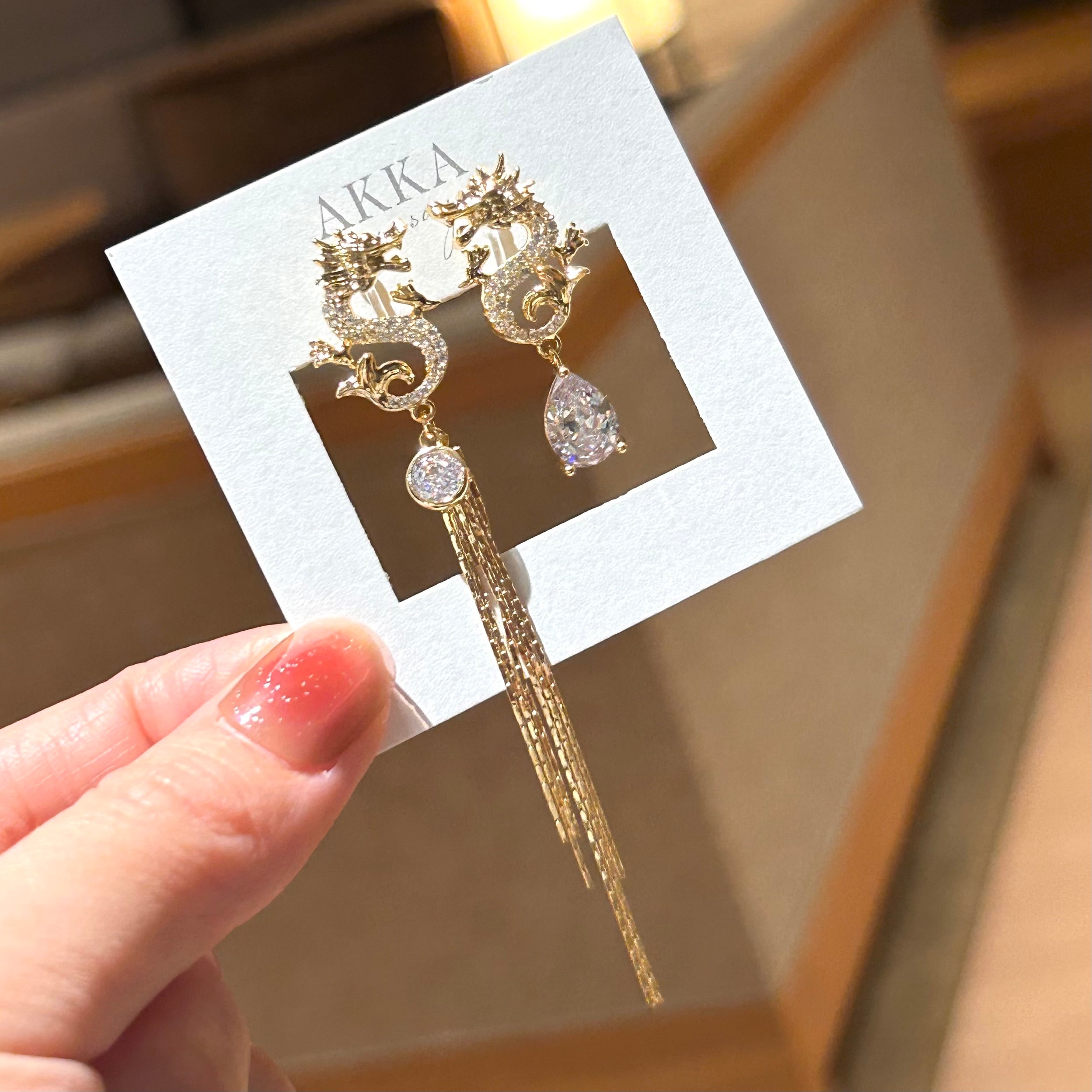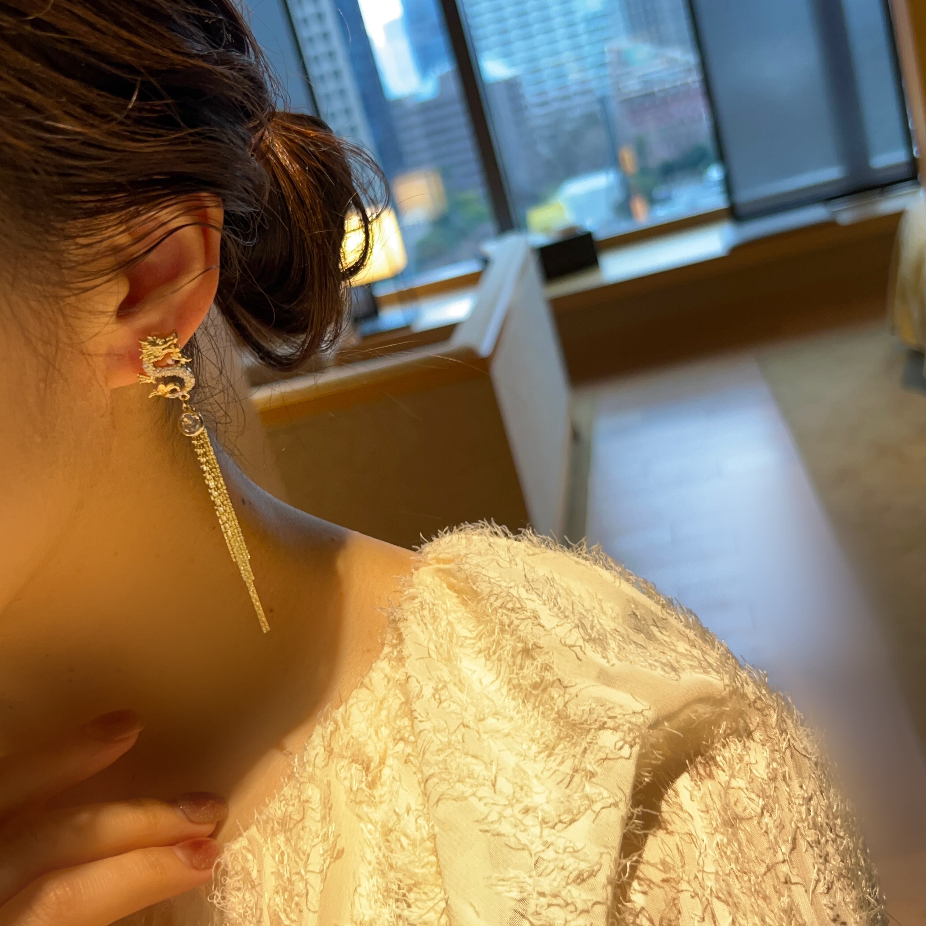 雫型ジルコニアビジューとロングタッセルが辛口モチーフとの相性が良く、存在感があり魅力的な耳元を演出します。