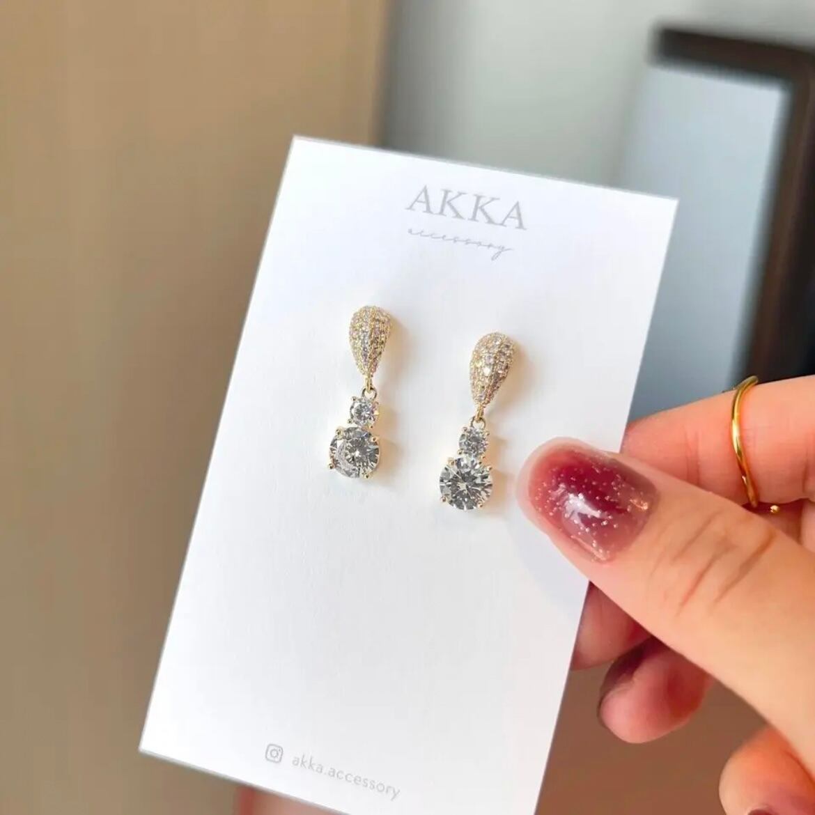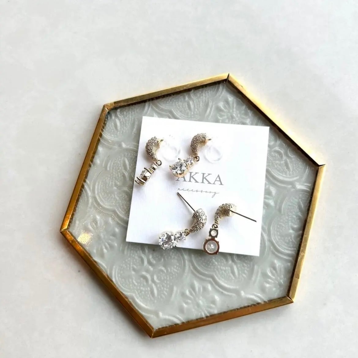 上部には雫型の小粒ジルコニアが眩く輝き続け、その下には大小のキュービックジルコニアを組み合わせて存在感のあるものに仕上がりました。