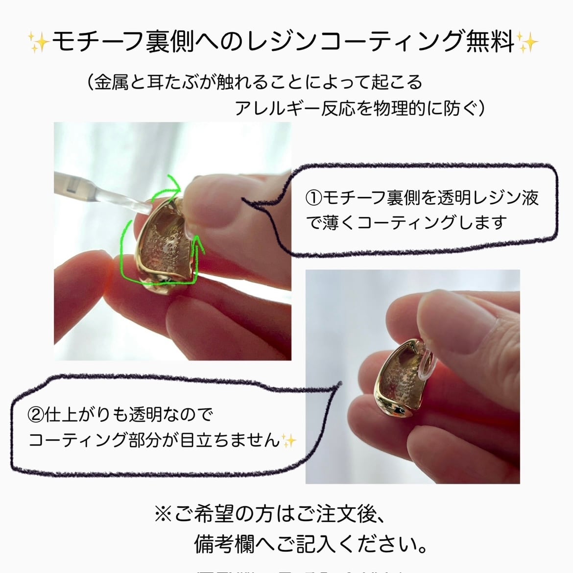 ◎モチーフ裏側のレジンコーティング無料(金属と耳が触れることによって起こるアレルギーを物理的に防ぐ。ご注文後備考欄へご記入ください)