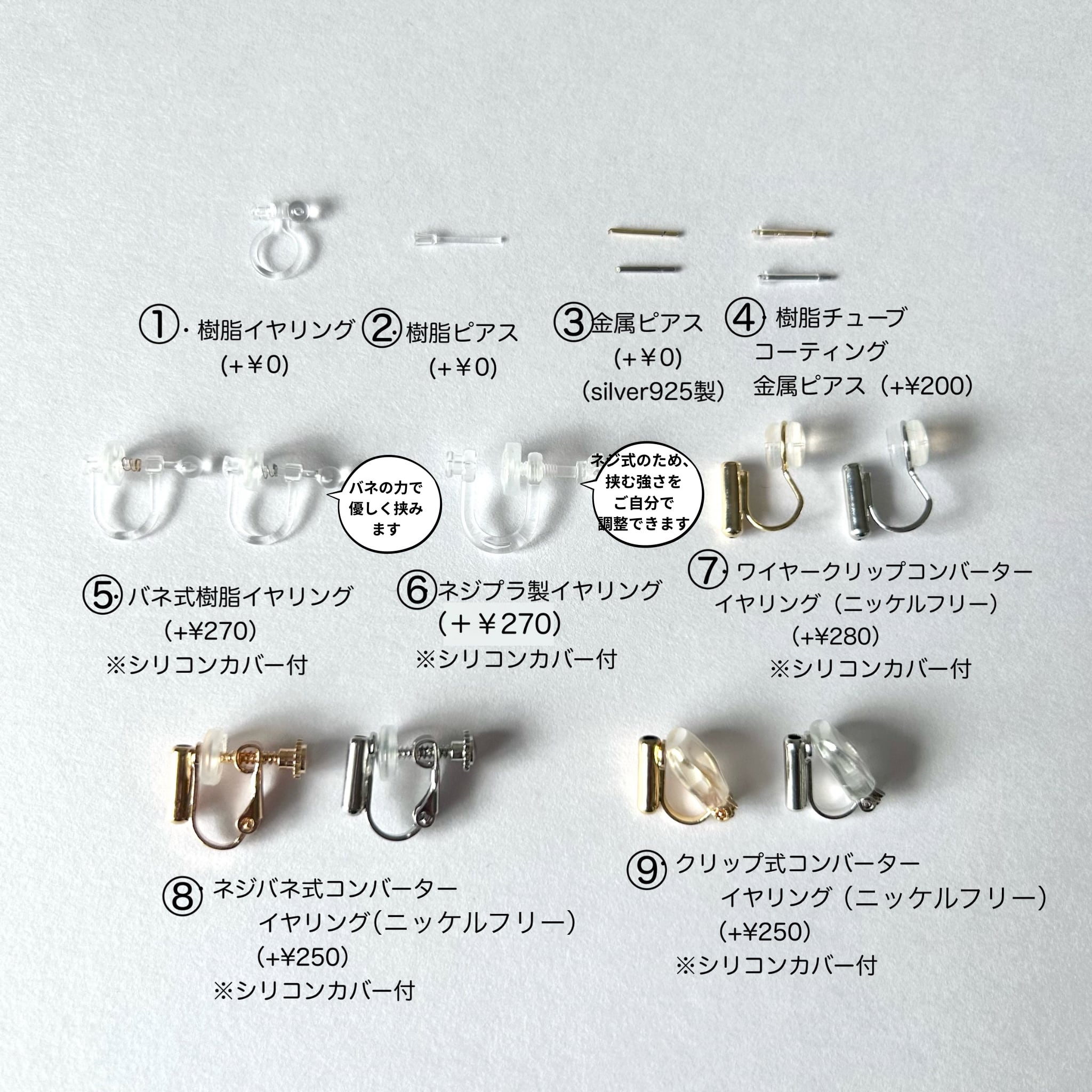 ⑨クリップ式コンバーターイヤリング(ニッケルフリー)※シリコンカバー付き(+¥250)