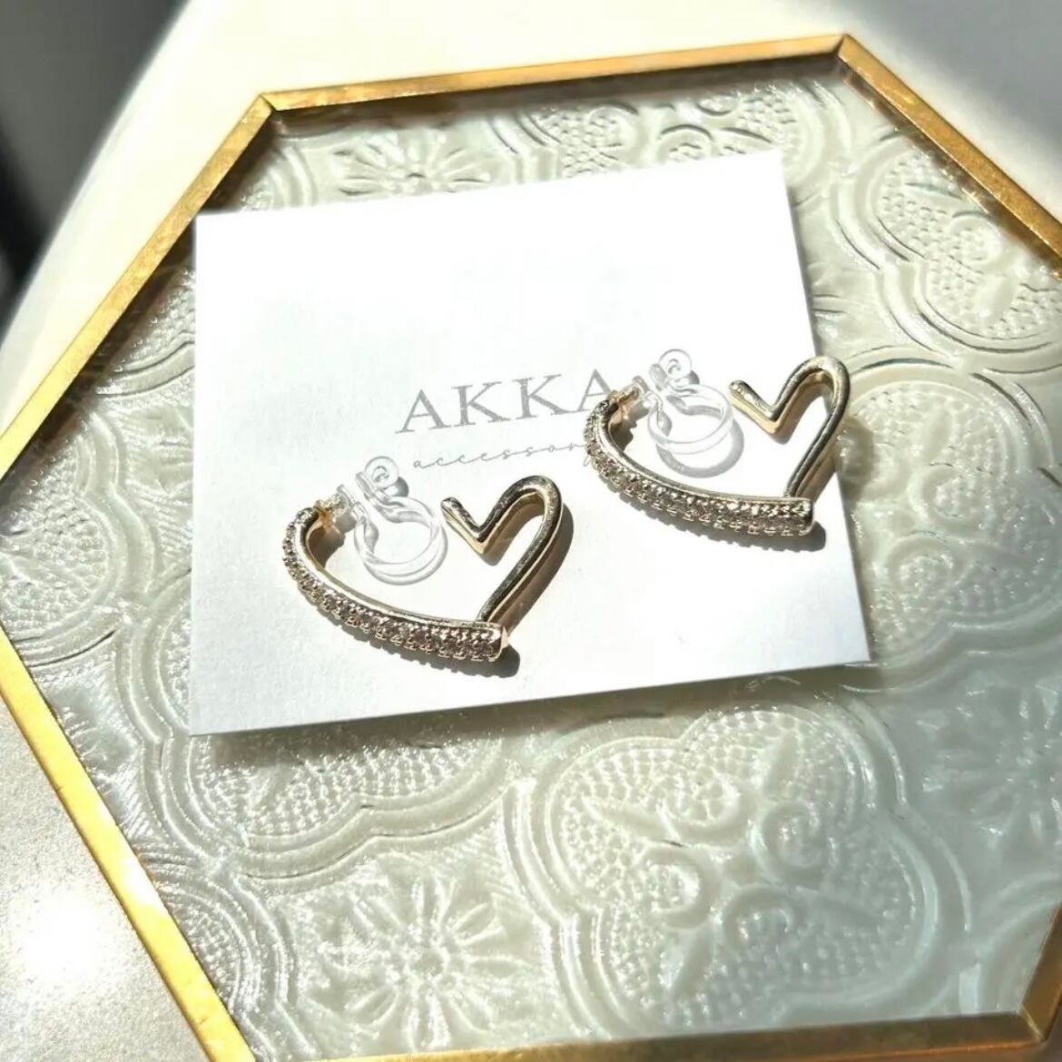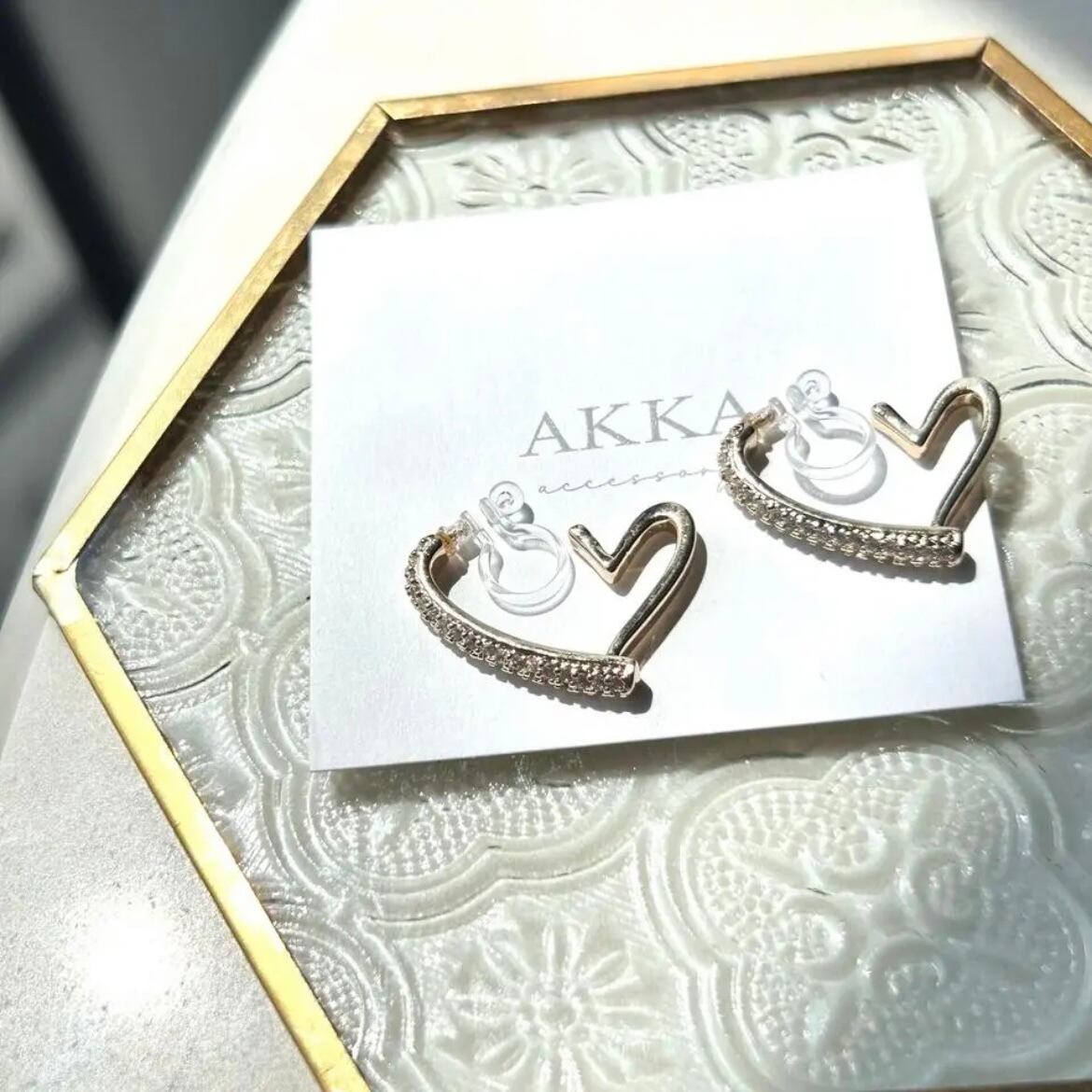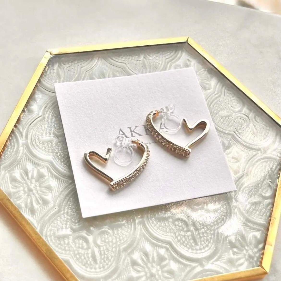 14kgp◆Gold Heart bijou hoop earring cute ハート ビジュー フープイヤリング CZダイヤ フープピアス 樹脂イヤリング 樹脂ピアス 金属アレルギー 可愛い