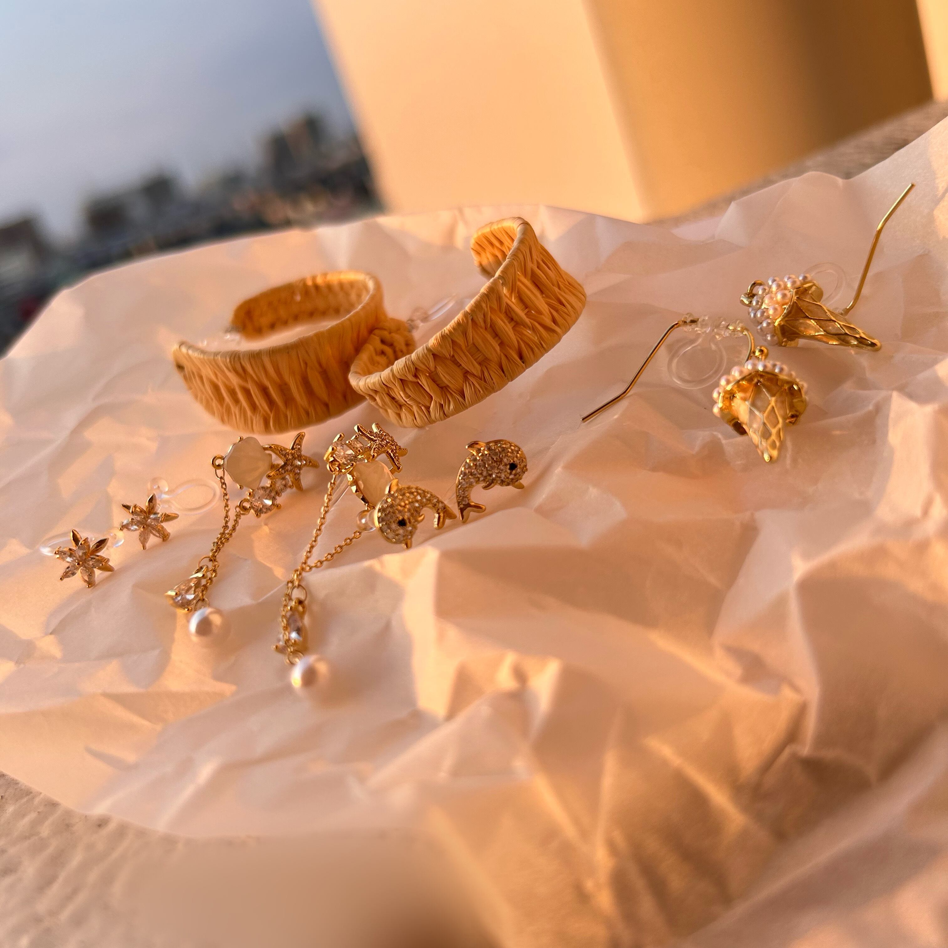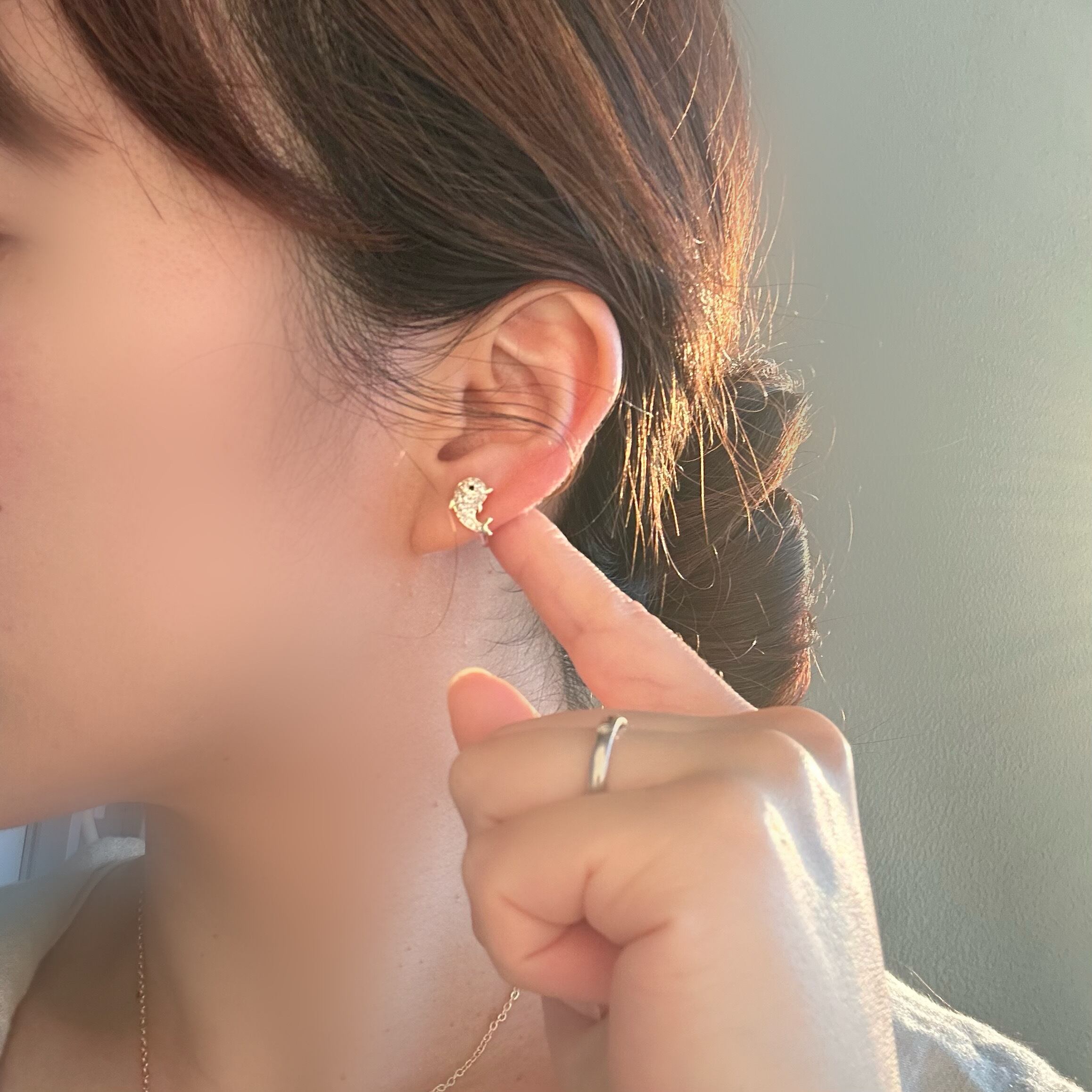 樹脂イヤリング金具が目立たないよう、イルカモチーフの裏に極力収まるように仕上げました。ピアスをしているかのような見た目となり、モチーフの存在感がより華やかにまとまります。