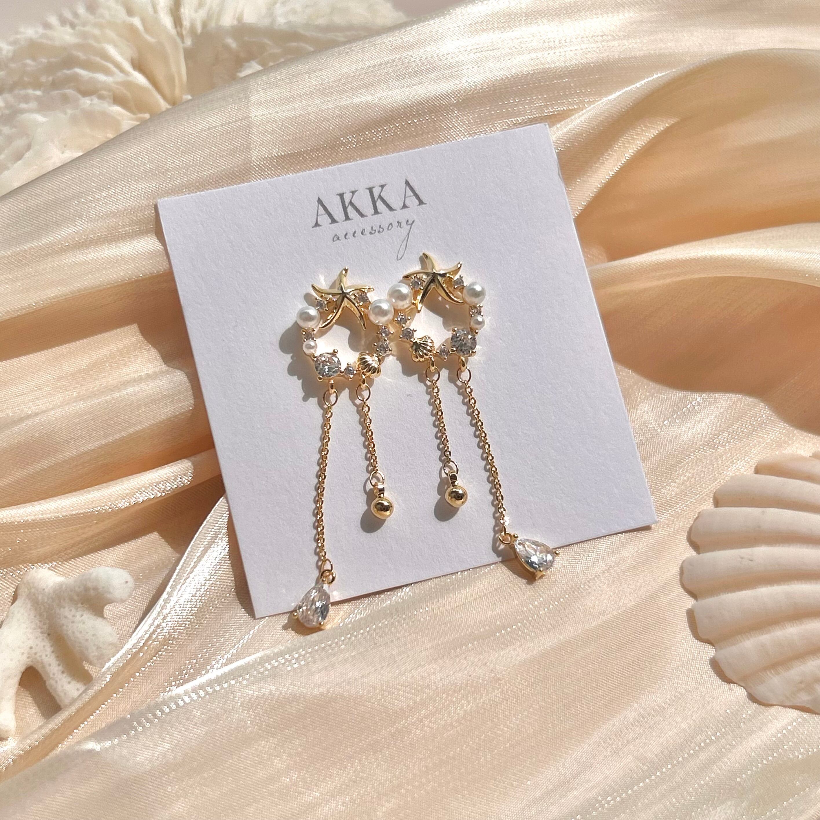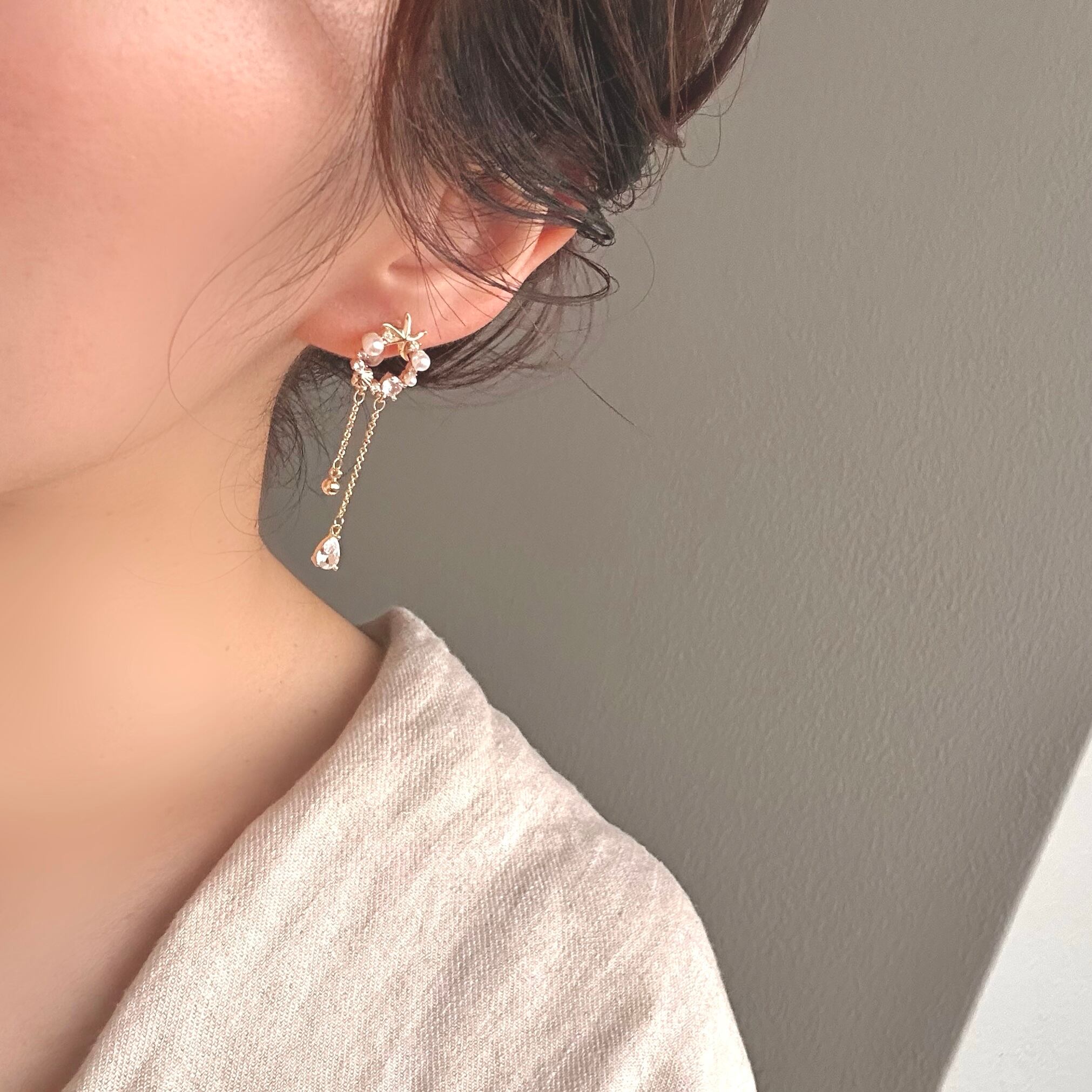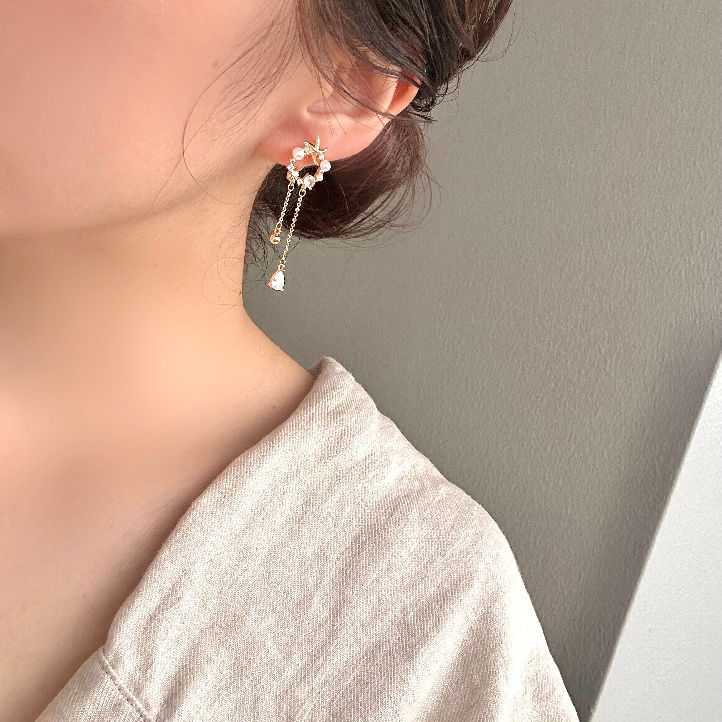 18kgp◆Shell hoop chain earring シェル フープイヤリング チェーン ヒトデ 樹脂イヤリング 貝殻 マリン 樹脂ピアス 金属アレルギー パール ジルコニア 大人可愛い
