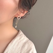 リースの下から2本のチェーンがゆらゆらと揺れながら存在感を出し、耳元を華やかに仕上げます。それぞれのチェーンの先にはゴールドボールチャームと雫型キュービックジルコニアチャームが付いており、さりげない輝きを放ちます。
