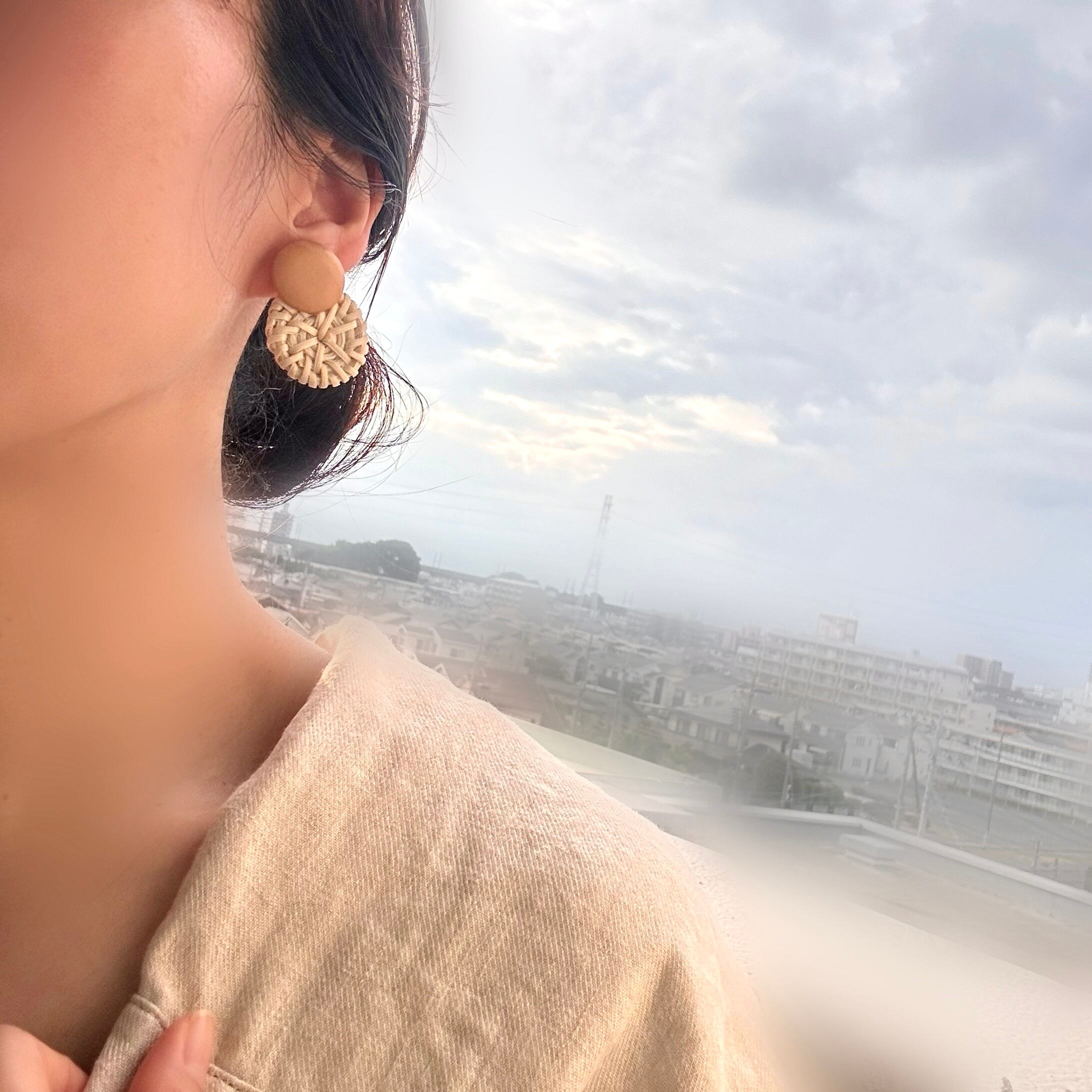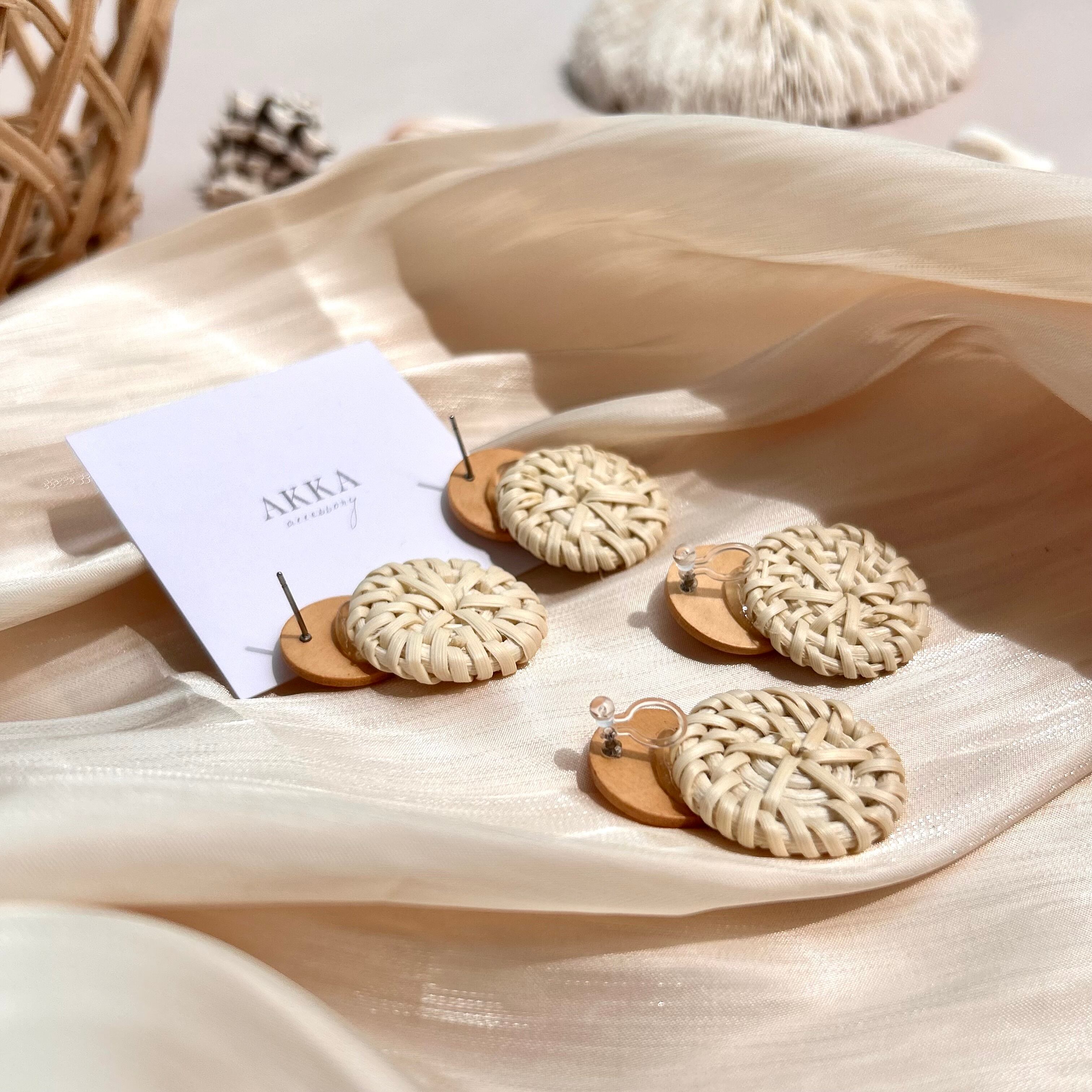 round rattan wood motif earring ラタン ウッドモチーフ イヤリング ピアス 軽い ノンホール 金属アレルギー 痛くない ヴィンテージ 大人 上品 AKKA 大ぶり