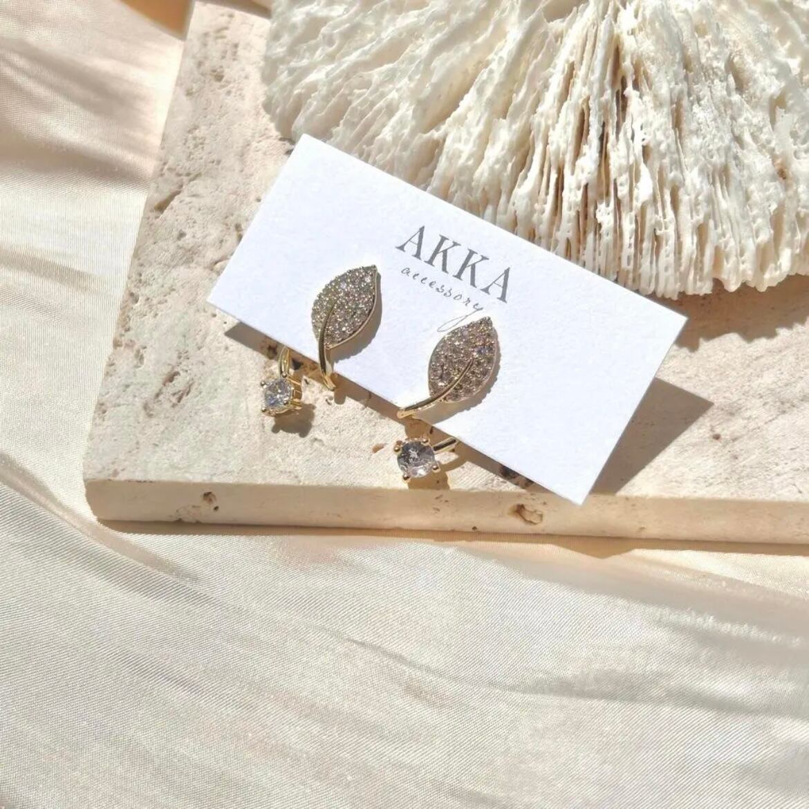 凛とした張りのあるリーフモチーフに、控えめに添えた一粒ラインストーンの組み合わせ。大人上品に耳元を飾ります。