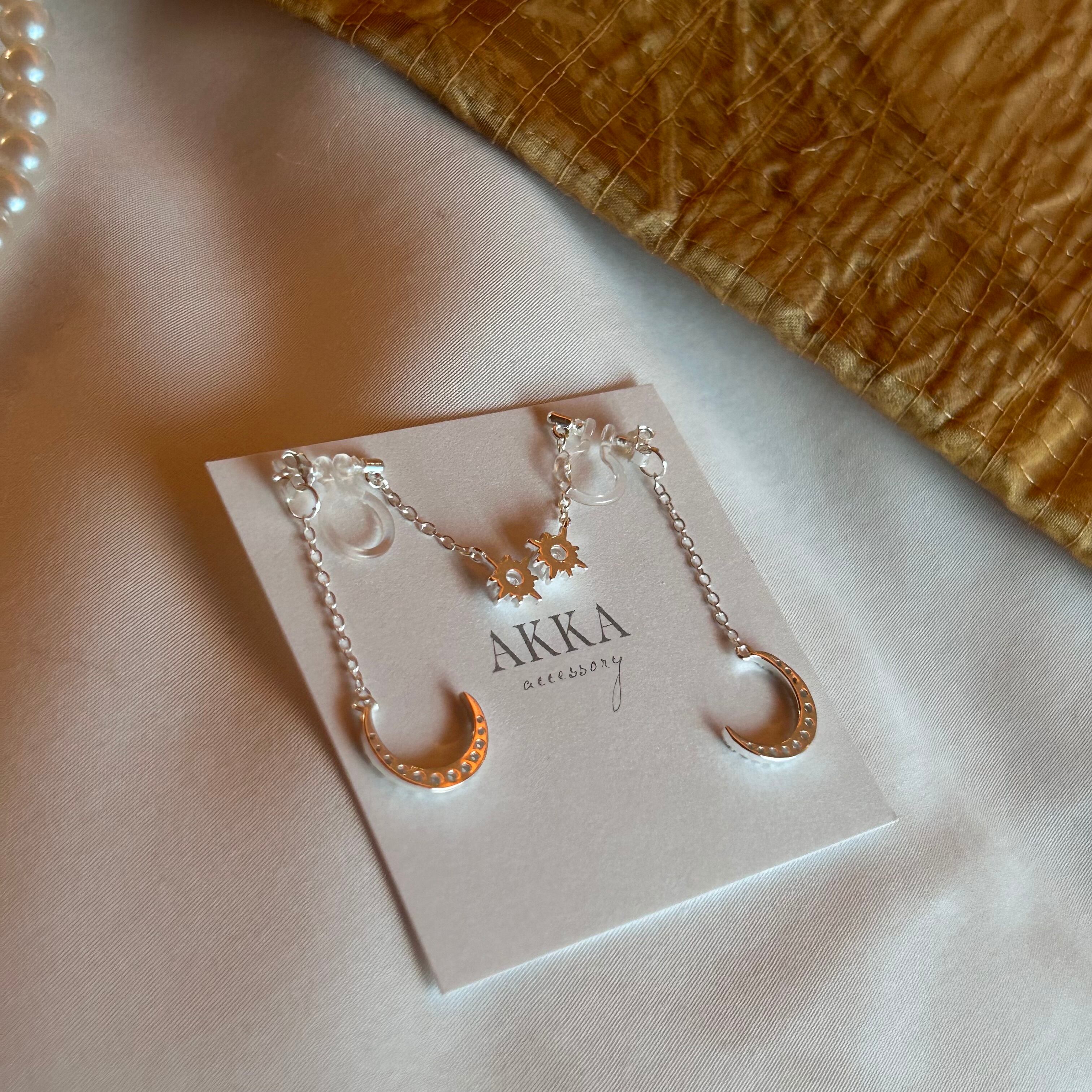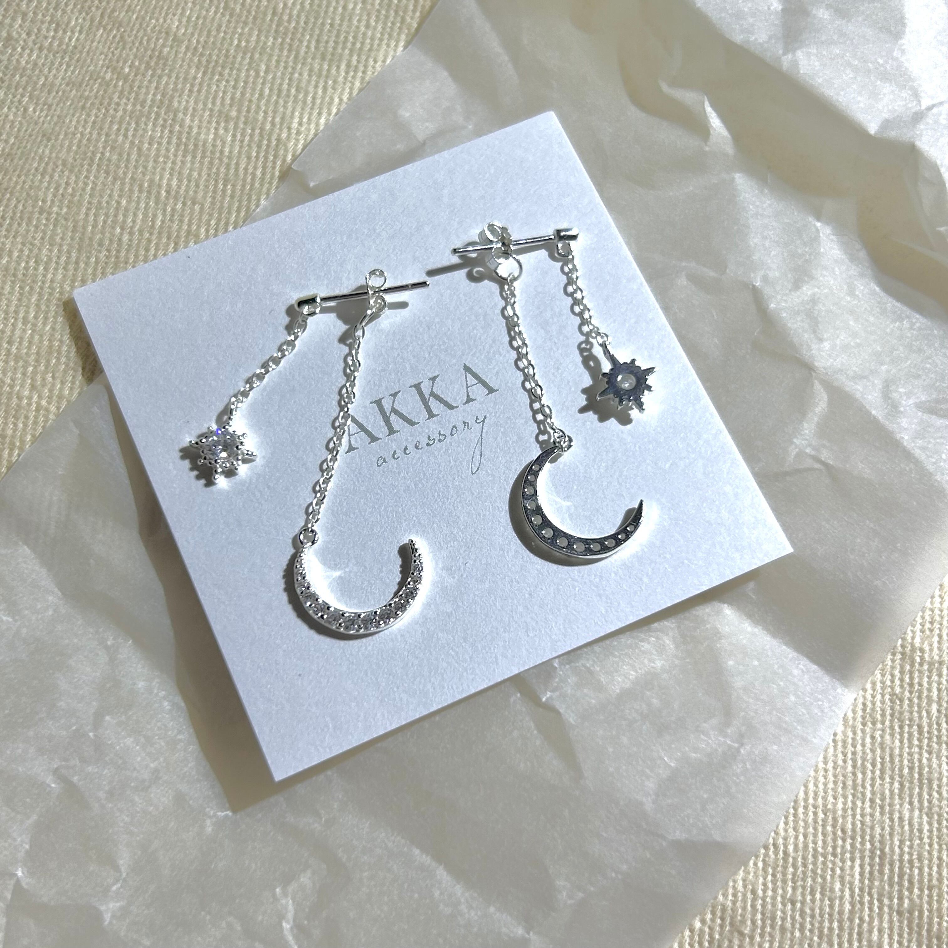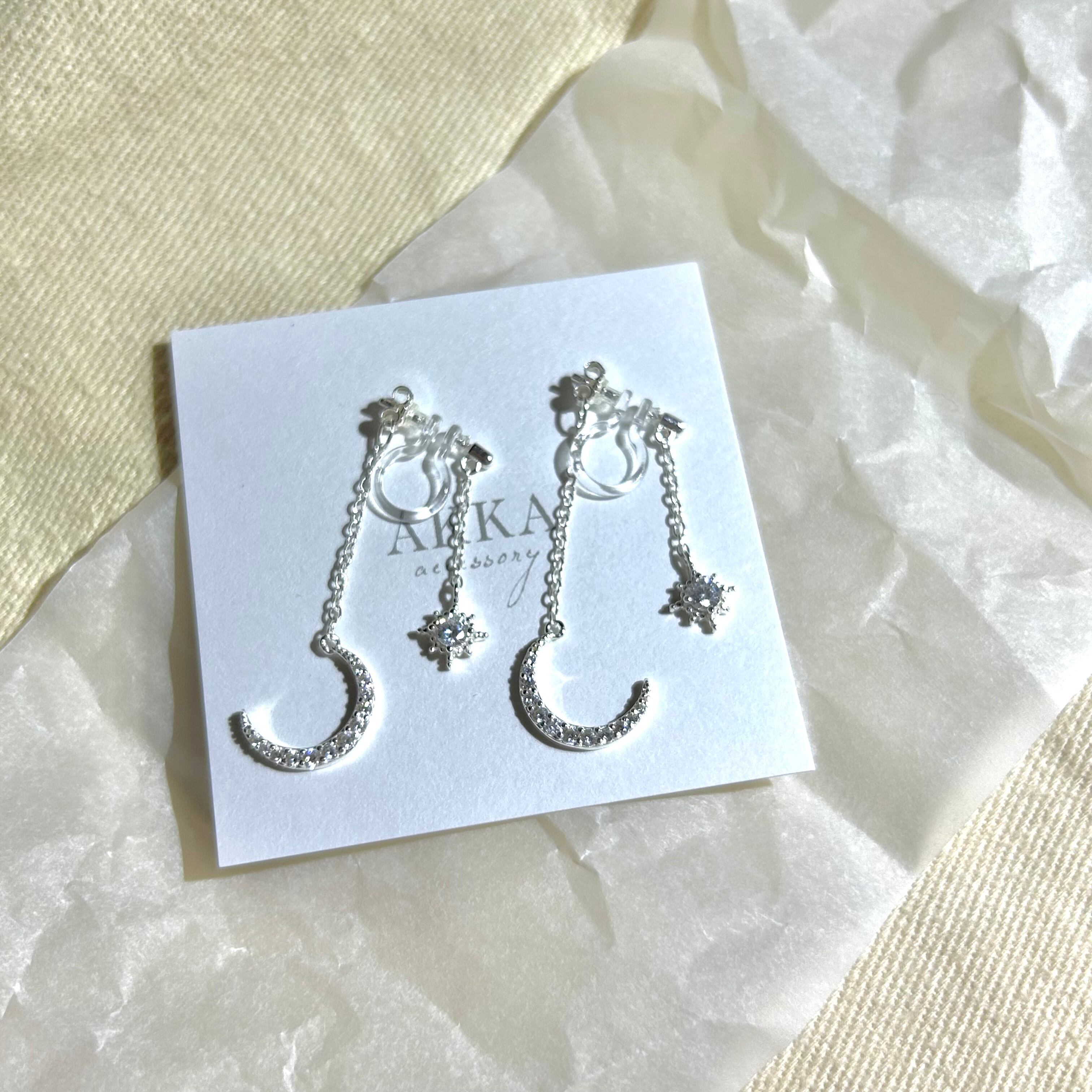 S925製◆moon star chain earring 月 星 ビジュー チェーン イヤリング 樹脂 金属アレルギー ピアス AKKA 可愛い お洒落 ピアスに見える 痛くない シルバー925