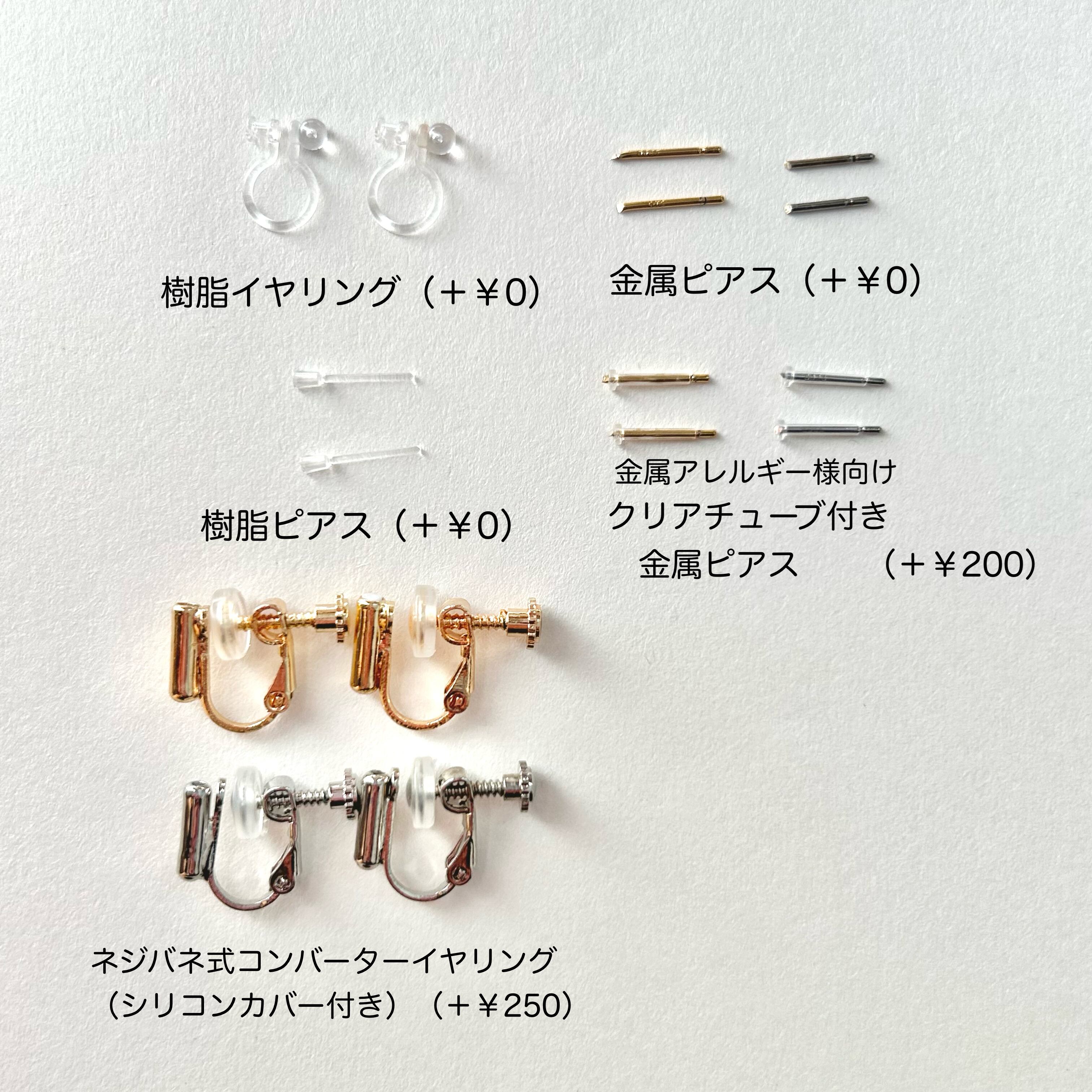 ピアス(樹脂ポストor金属ポスト)、ネジバネ式イヤリングにも変更可能です。