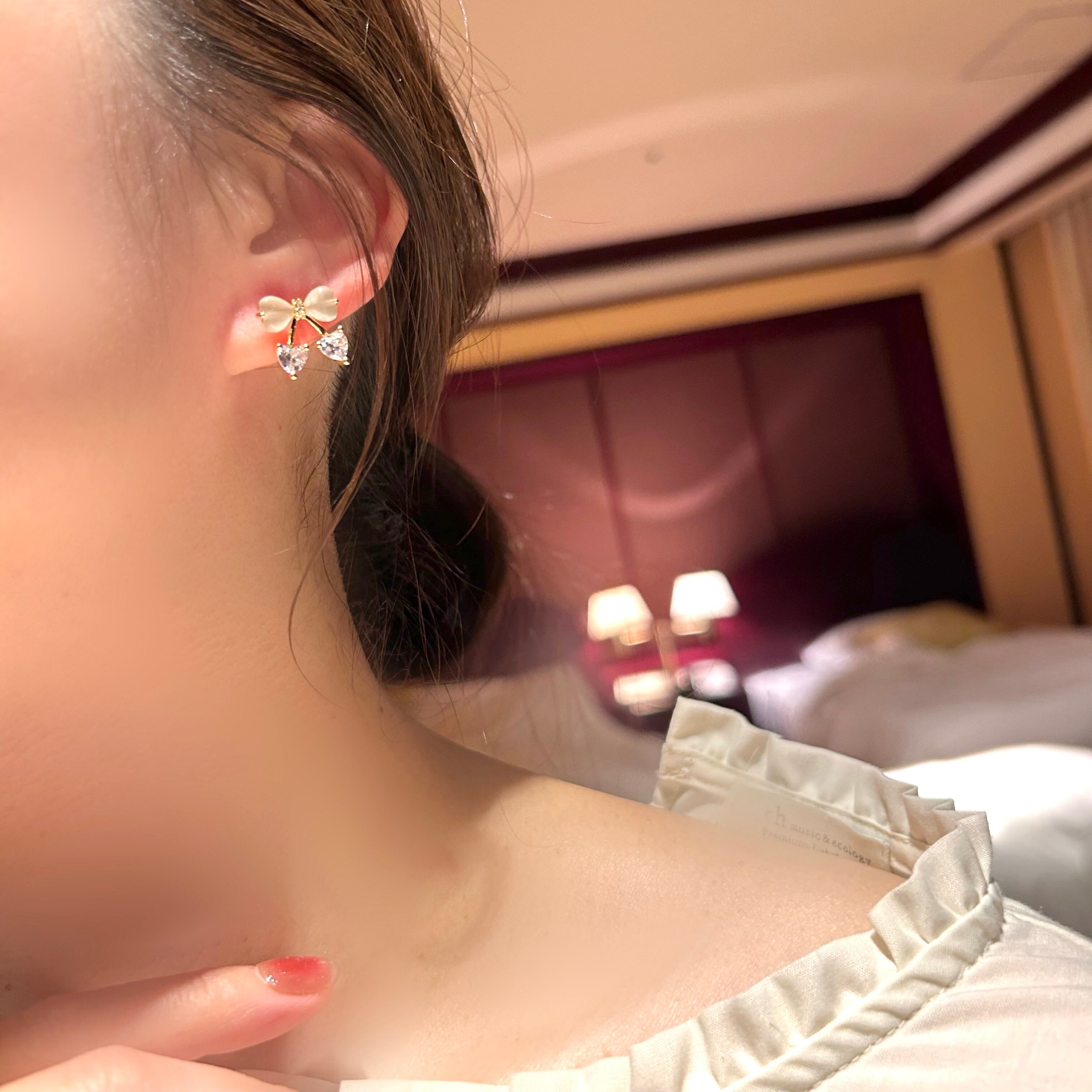 ハートのアクセサリー S925 14kgp◆Heart ribbon bijou earring ハート ビジュー イヤリング ピアス 樹脂 可愛い 金アレ 金属アレルギー キャッツアイ 天然石 ゴールド 14k 可愛い AKKA