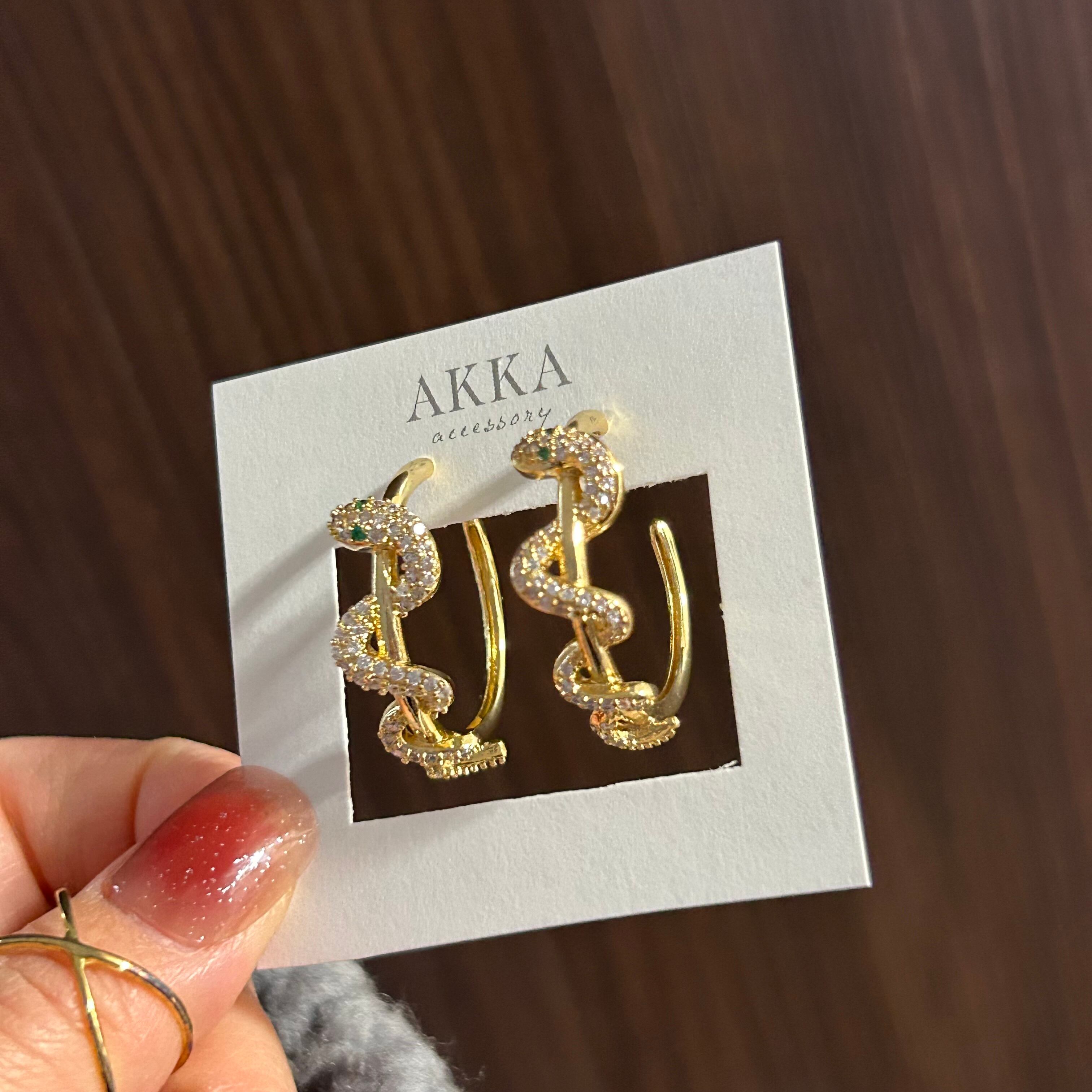 蛇がフープに巻き付いているデザインが個性的ながらも上品な雰囲気があります。目の色は落ち着いたグリーンカラーになっており、さまざまなファッションに合わせやすい色合いとなっております。