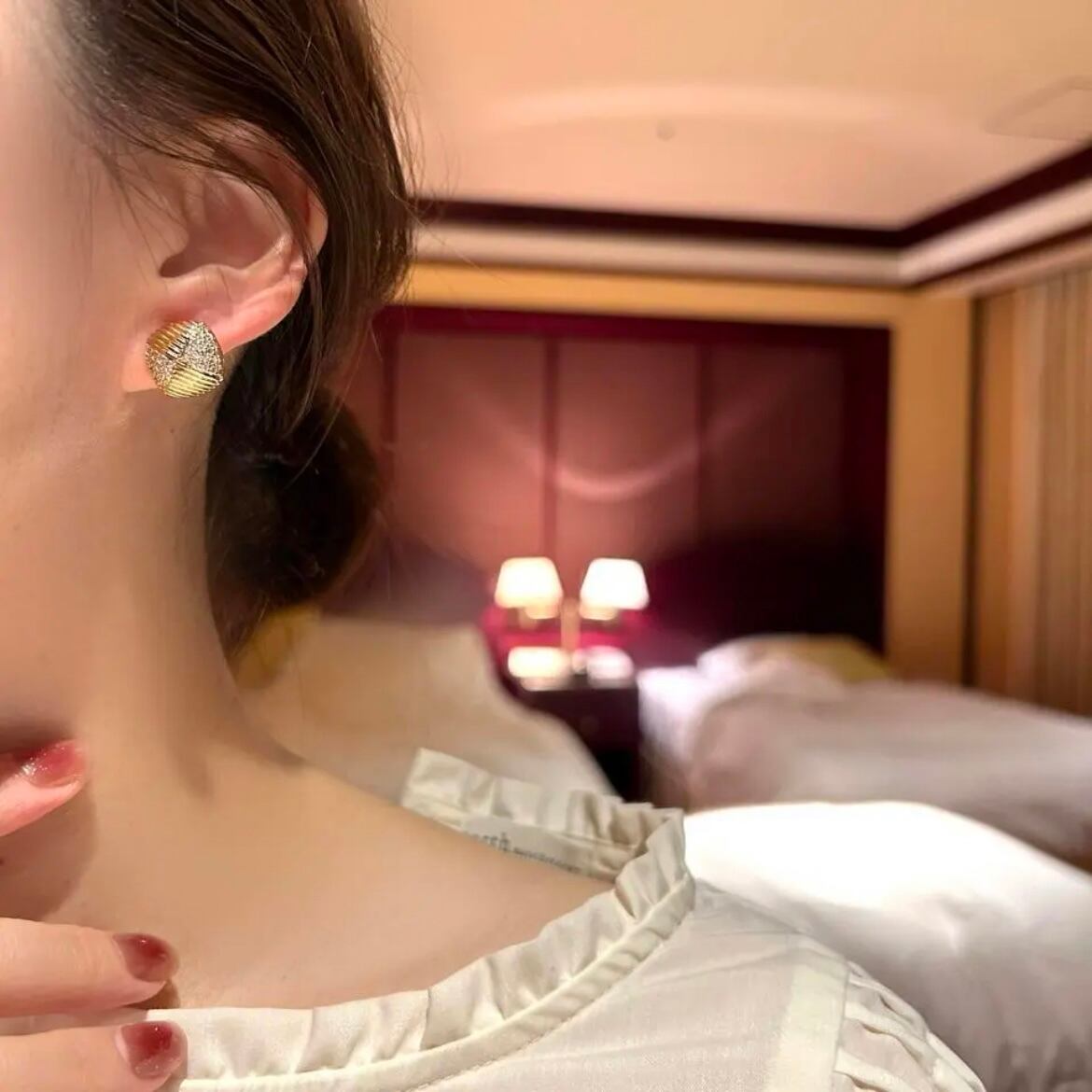 落ち着いたヴィンテージゴールドカラーが耳元を上品に照らし続けてくれます。丸みを帯びたスクエア型で、硬くなりすぎずにニュアンスさを強調した、抜け感のある雰囲気がとても付けやすいです。シーズンを問いませんのでメイン使い間違いなしのオススメアイテムです。