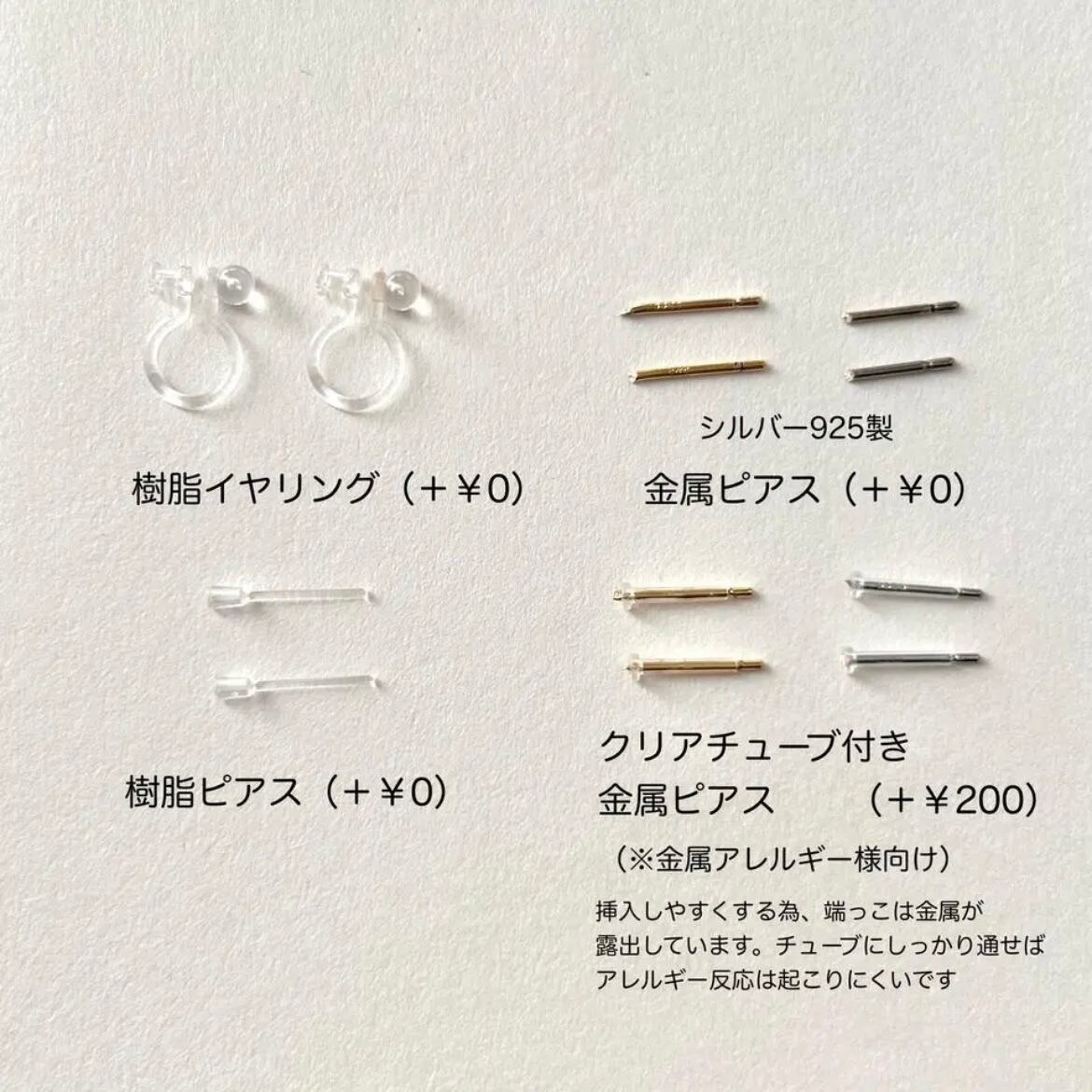 イヤリング金具は樹脂なので金属アレルギーの方にもお使いいただけます。