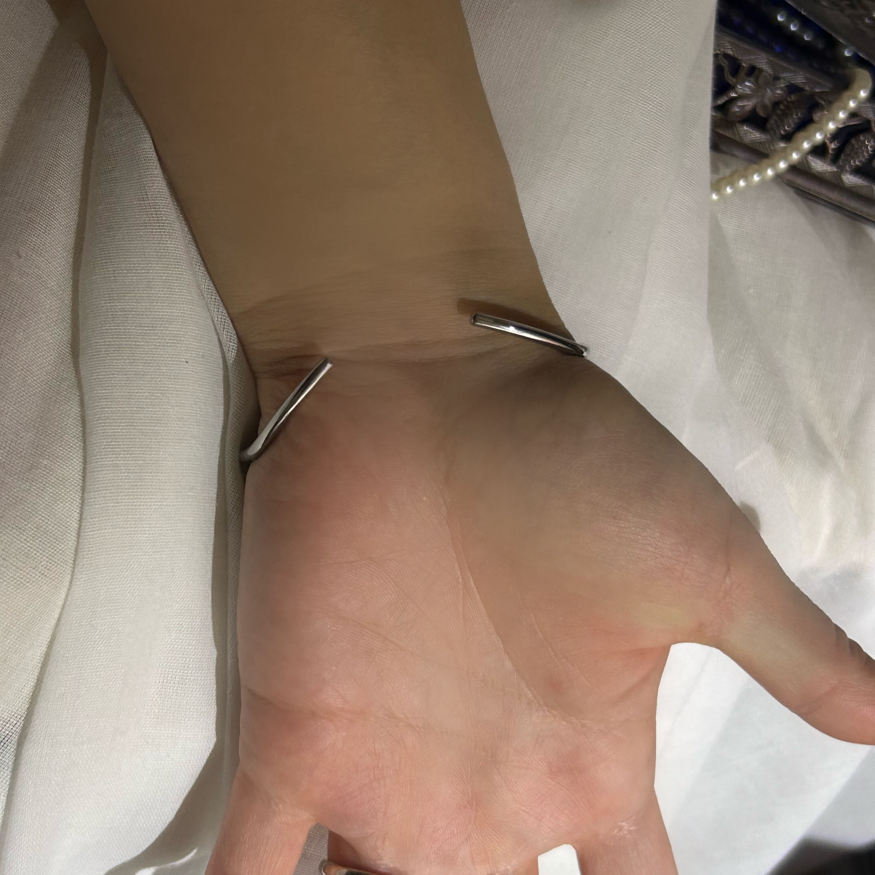 硬いので、変形して腕から落ちる心配もございません。腕にはめる際には手首の1番細いところから、バングルを少し広げ、装着します。開く時はちょっと動く程度ですがすぐに戻ります。