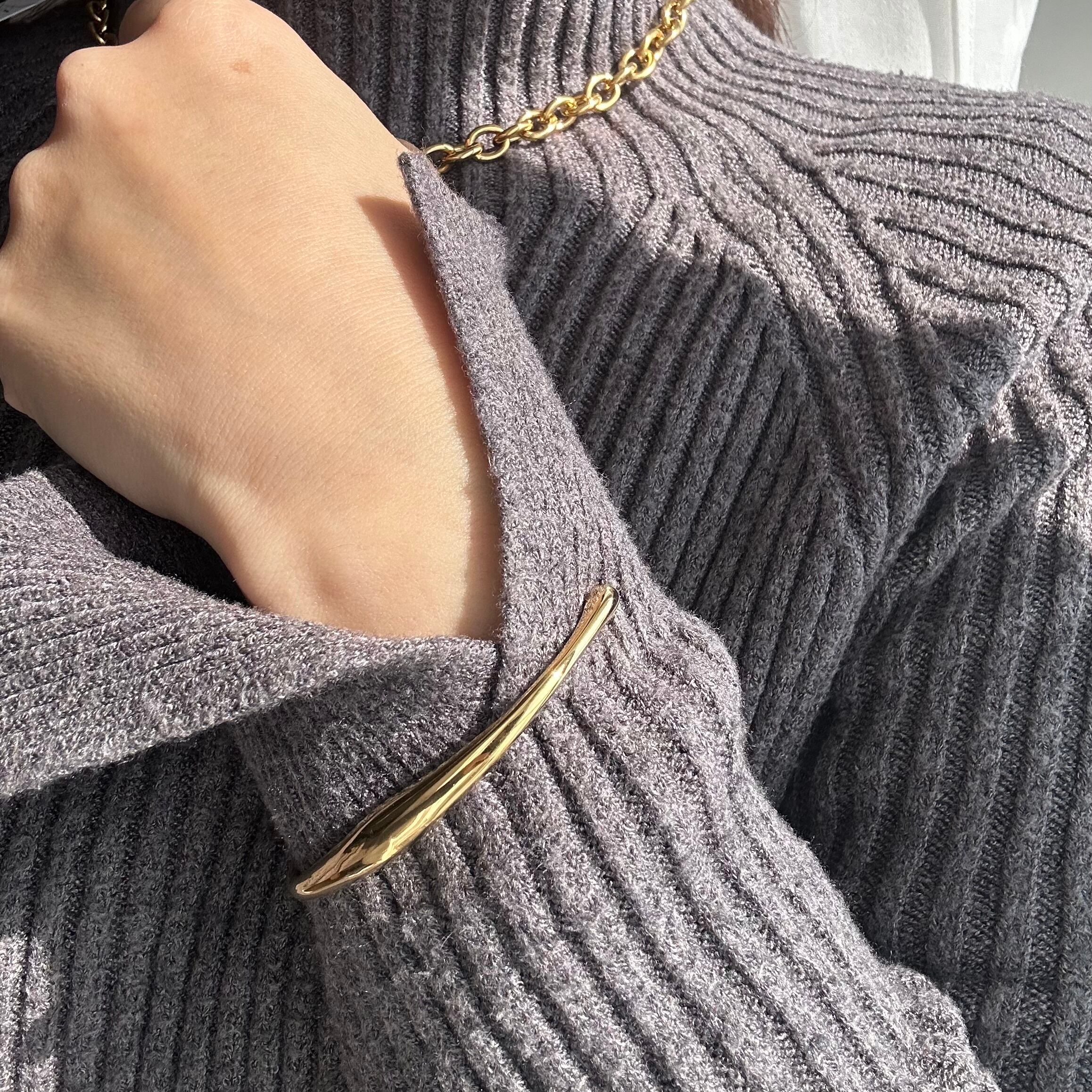 硬いので、変形して腕から落ちる心配もございません。腕にはめる際には手首の1番細いところから、バングルを少し広げ、装着します。開く時はちょっと動く程度ですがすぐに戻ります。