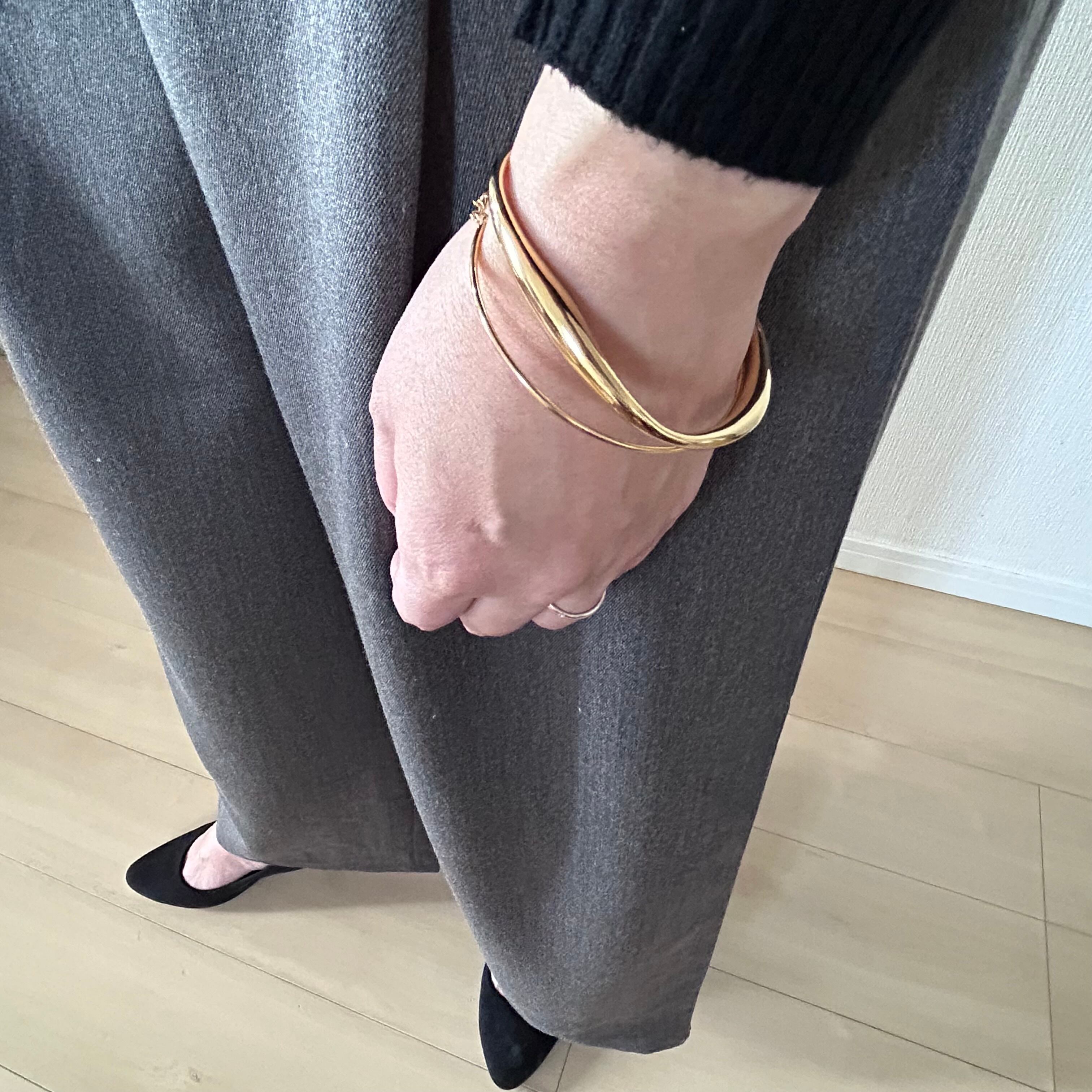 スカートコーデ、パンツコーデの写真のように、お手持ちのブレスレットと重ね付けすることでボリュームアップを叶え、こなれ感や個性を加えることができます。